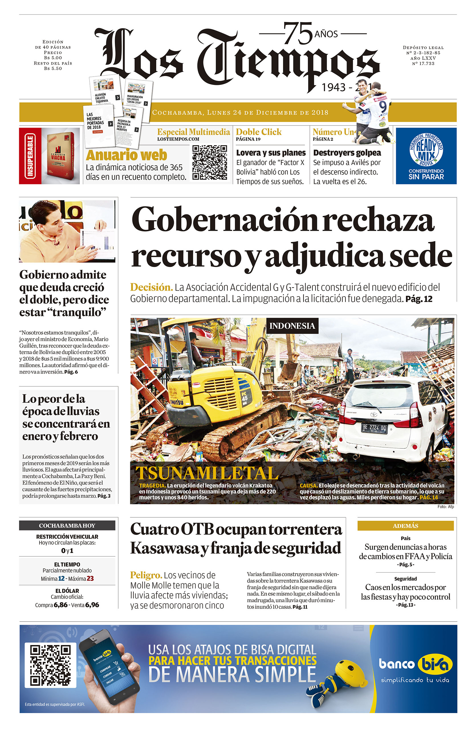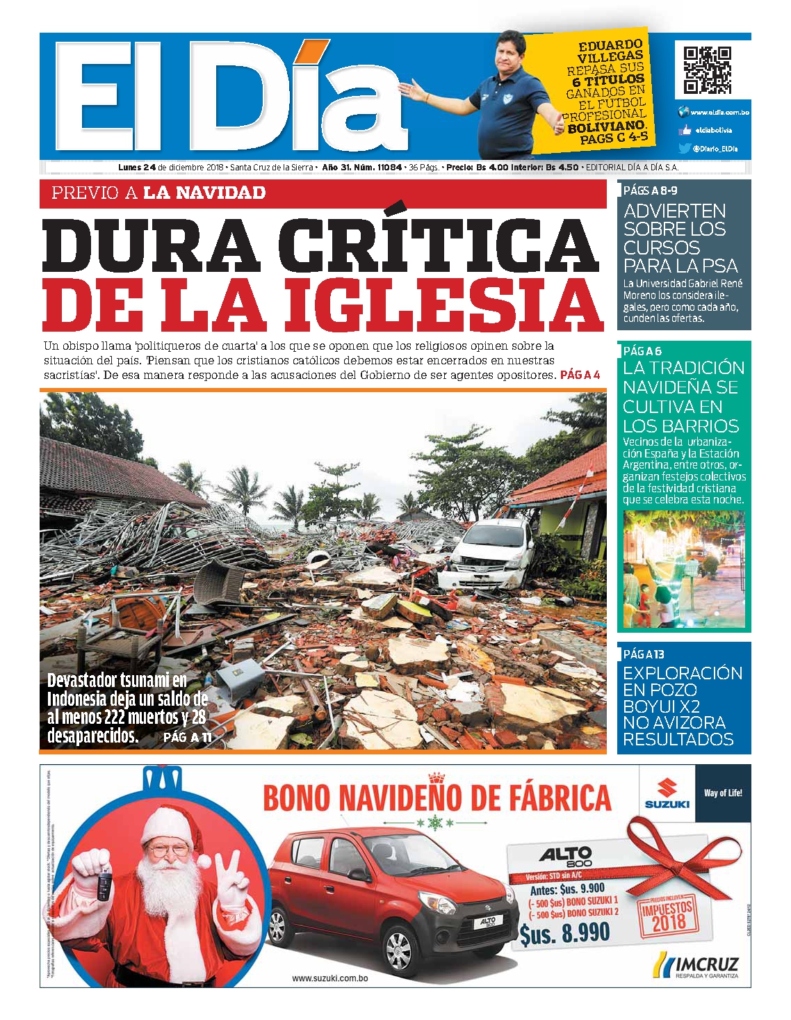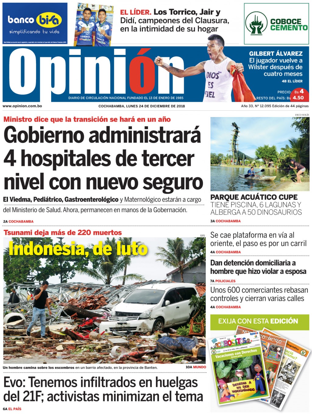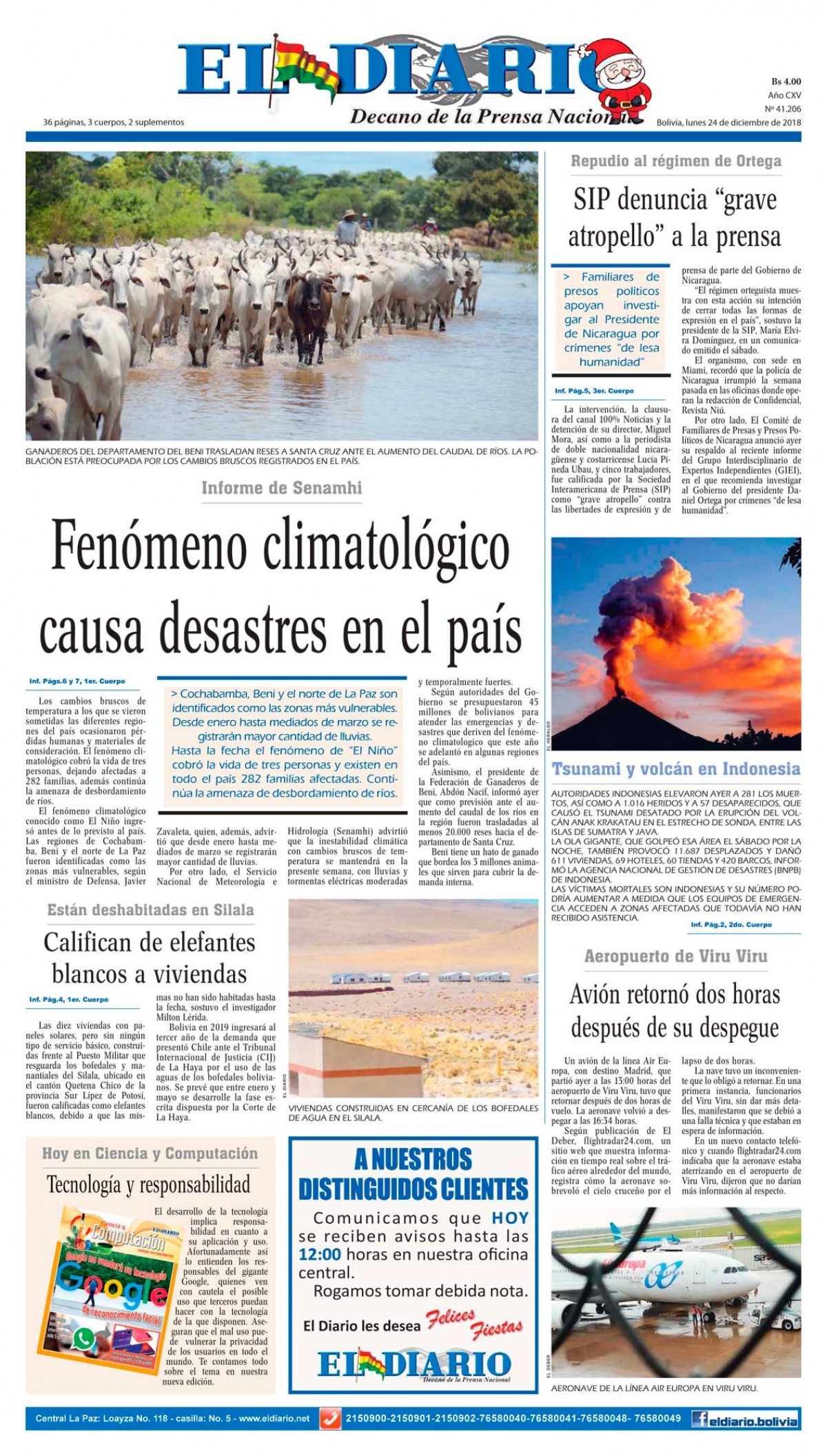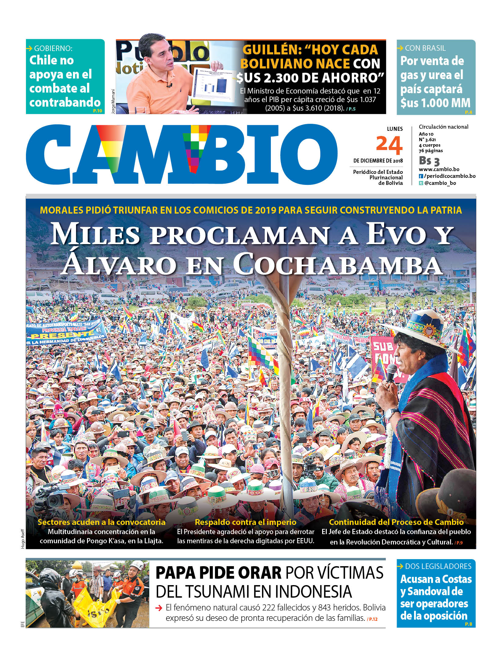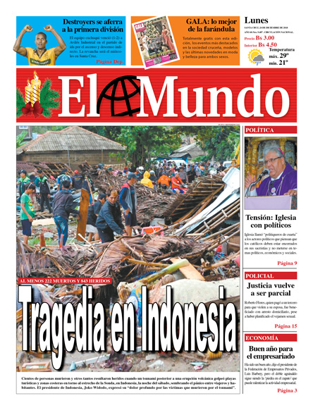 Portadas de periódicos de Bolivia del lunes 24 de diciembre de 2018Categorías MonitoreoEtiquetas , Portadas de periódicos 24/12/2018 El Deber – Los Tiempos – El Día – La Razón – Cambio – El Diario – Página Siete – Opinión