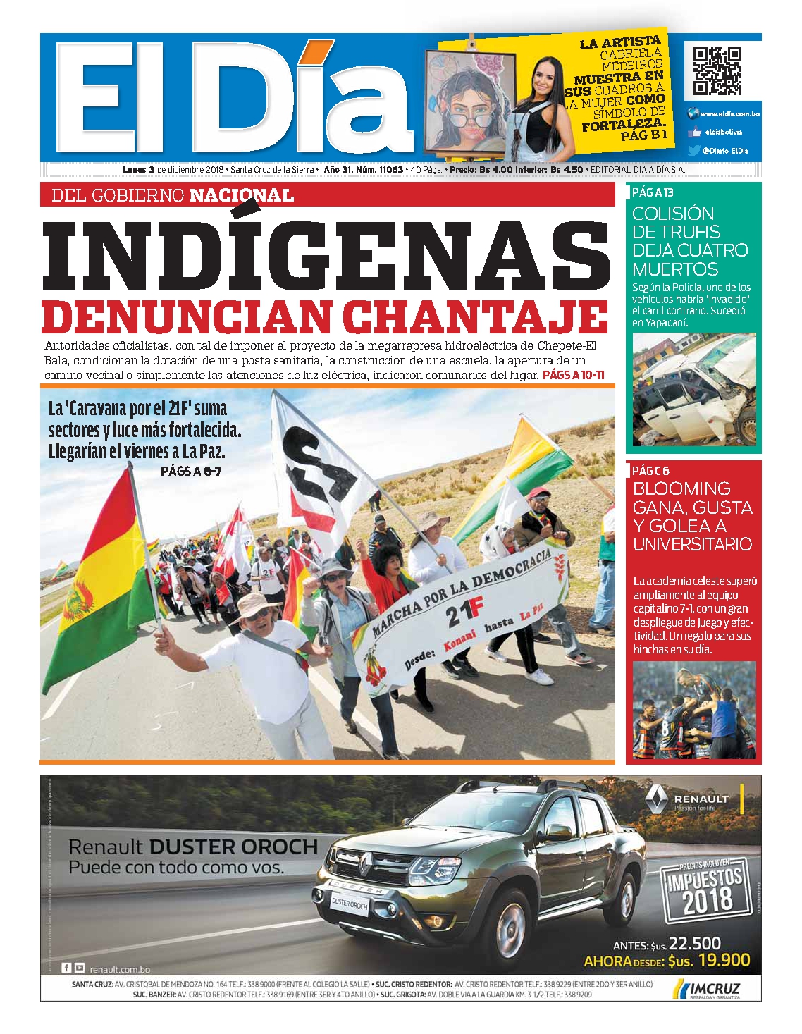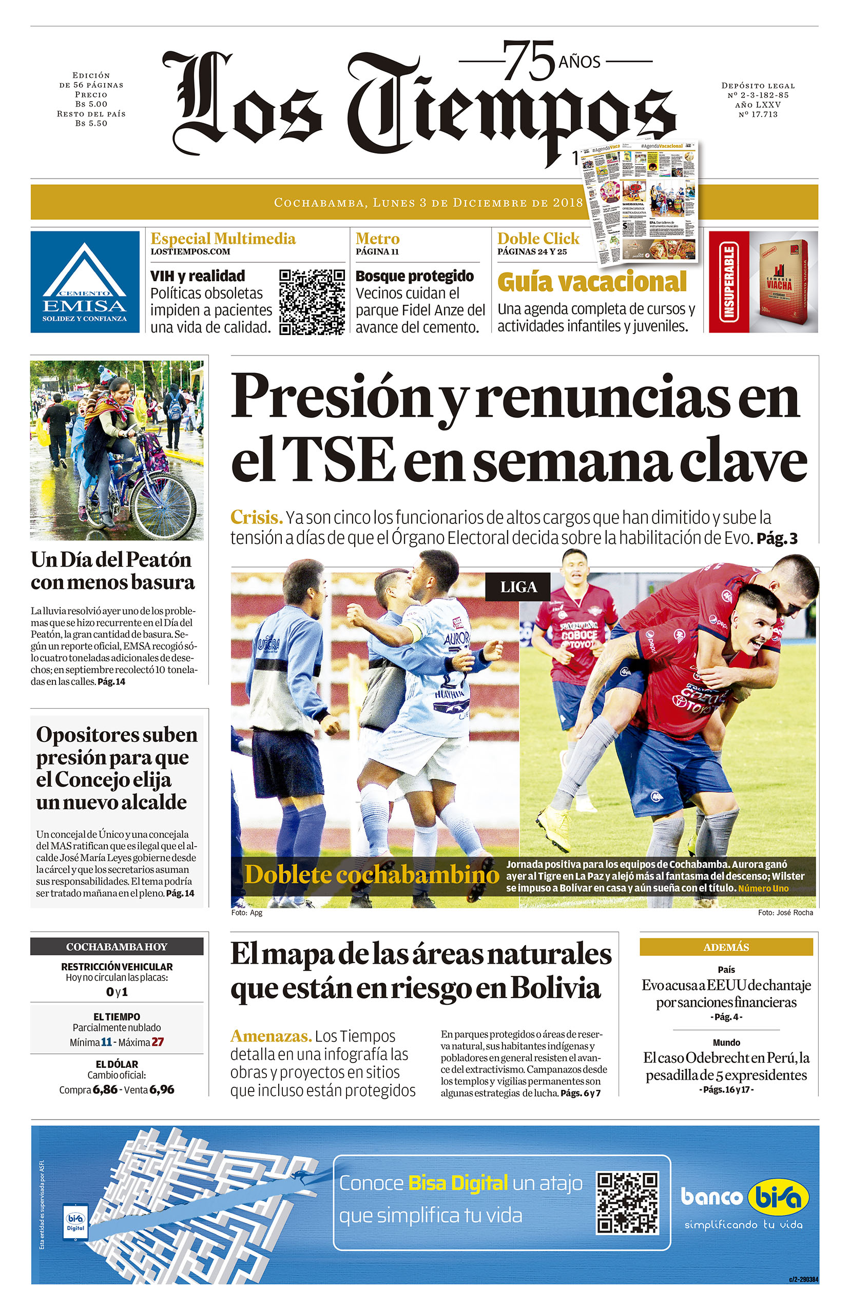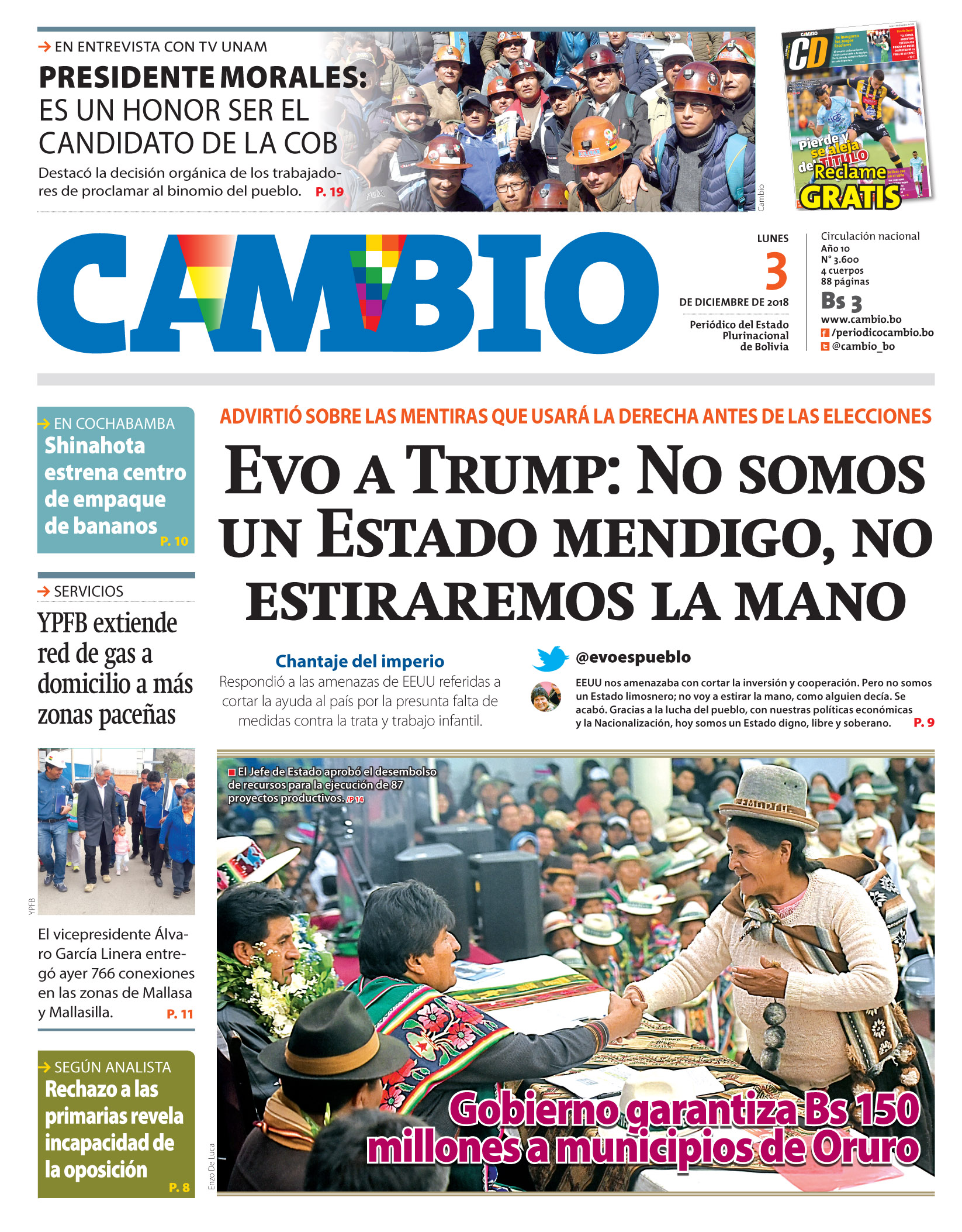 Portadas de periódicos de Bolivia del lunes 3 de diciembre de 2018Categorías MonitoreoEtiquetas , Portadas de periódicos 03/12/2018 El Deber – Los Tiempos – El Día – La Razón – Cambio – El Diario – Página Siete – Opinión