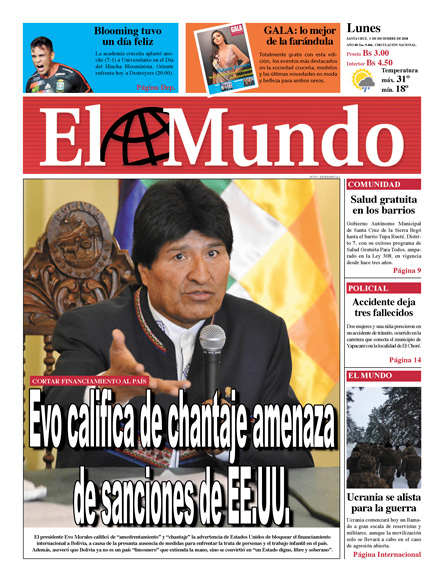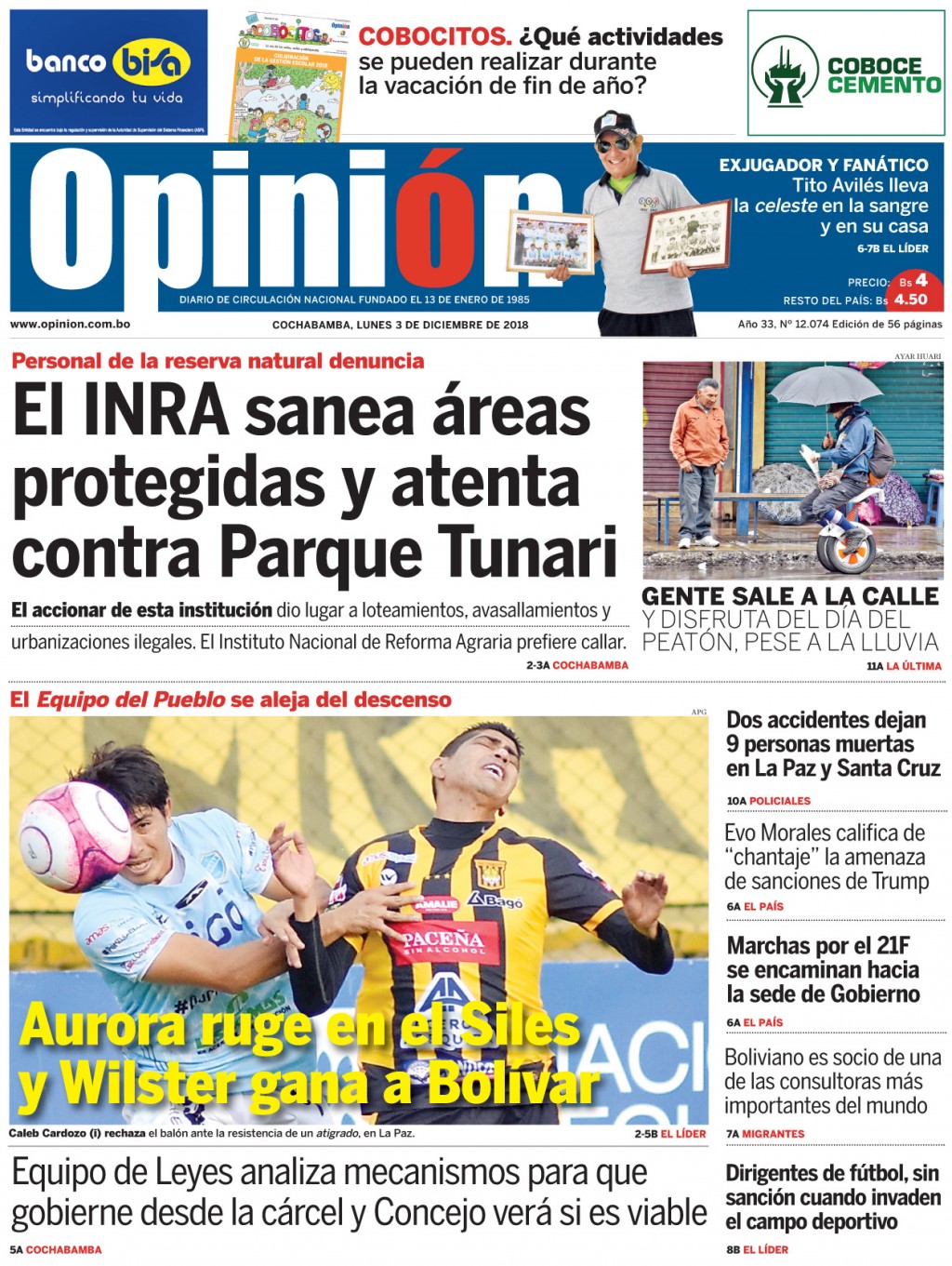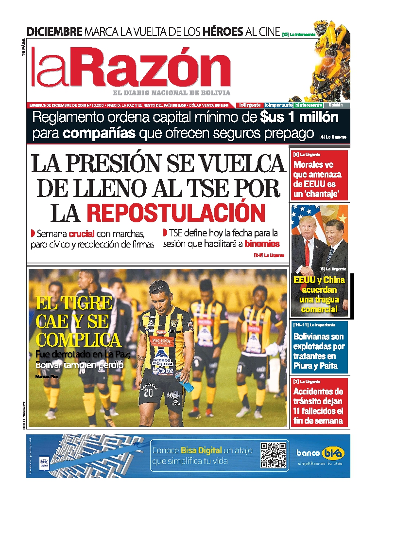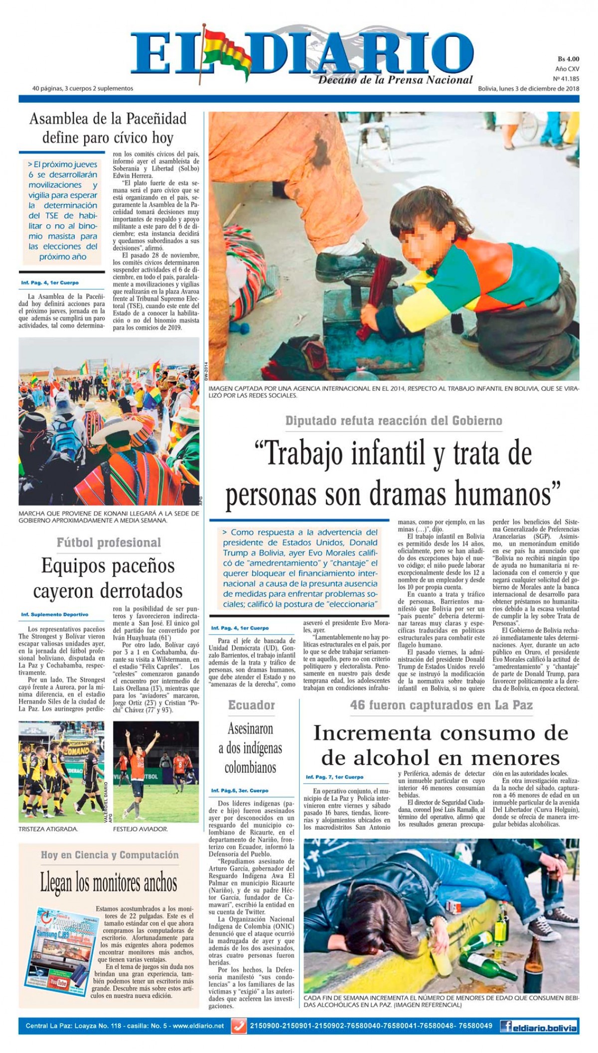 Portadas de periódicos de Bolivia del lunes 3 de diciembre de 2018Categorías MonitoreoEtiquetas , Portadas de periódicos 03/12/2018 El Deber – Los Tiempos – El Día – La Razón – Cambio – El Diario – Página Siete – Opinión