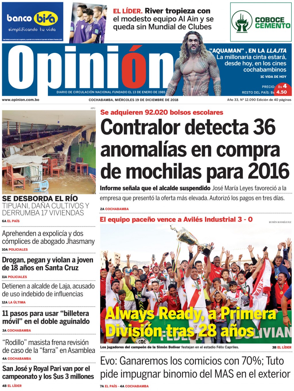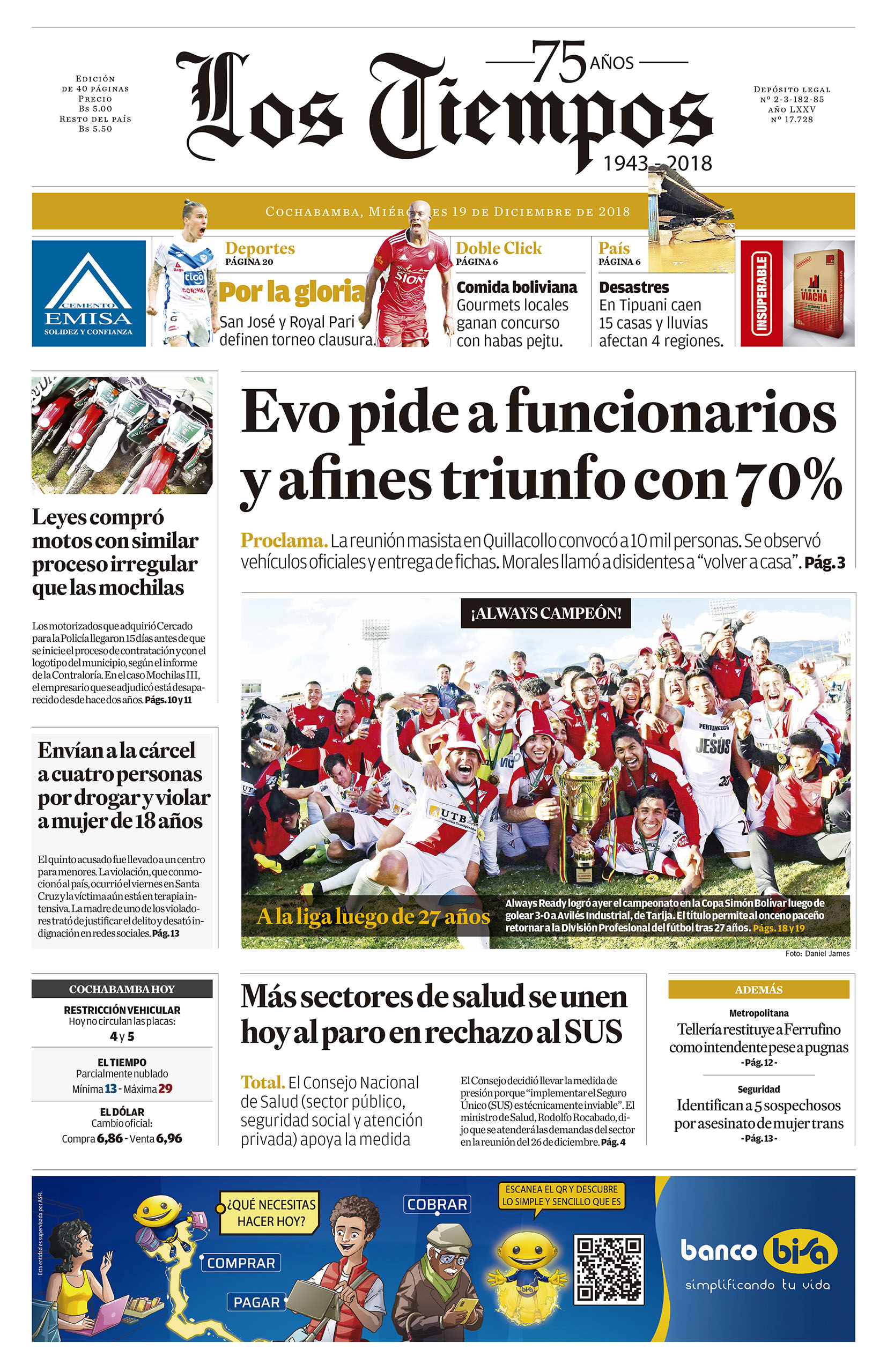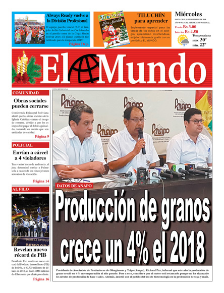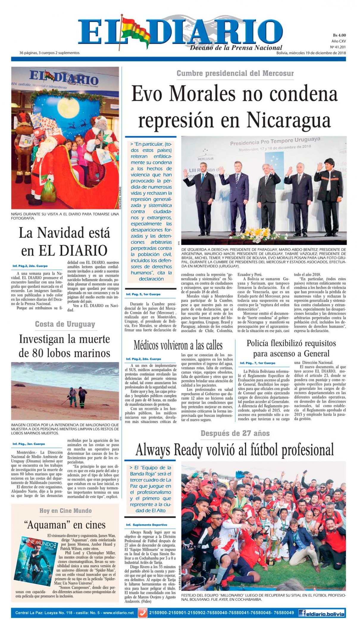 Portadas de periódicos de Bolivia del miércoles 19 de diciembre de 2018