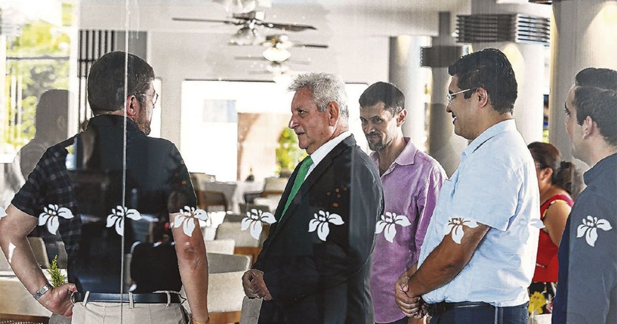El gobernador de Santa Cruz y líder de Demócratas acudió a Los Tajibos para participar de una sesión fotográfica a invitación de EL DEBER, con ocasión del fin de año. Costas caminaba desde el salón El Conquistador hacia el lobby del hotel cuando percibió que Doria Medina se encontraba sentado, junto con uno de sus asesores, en el restaurante.
