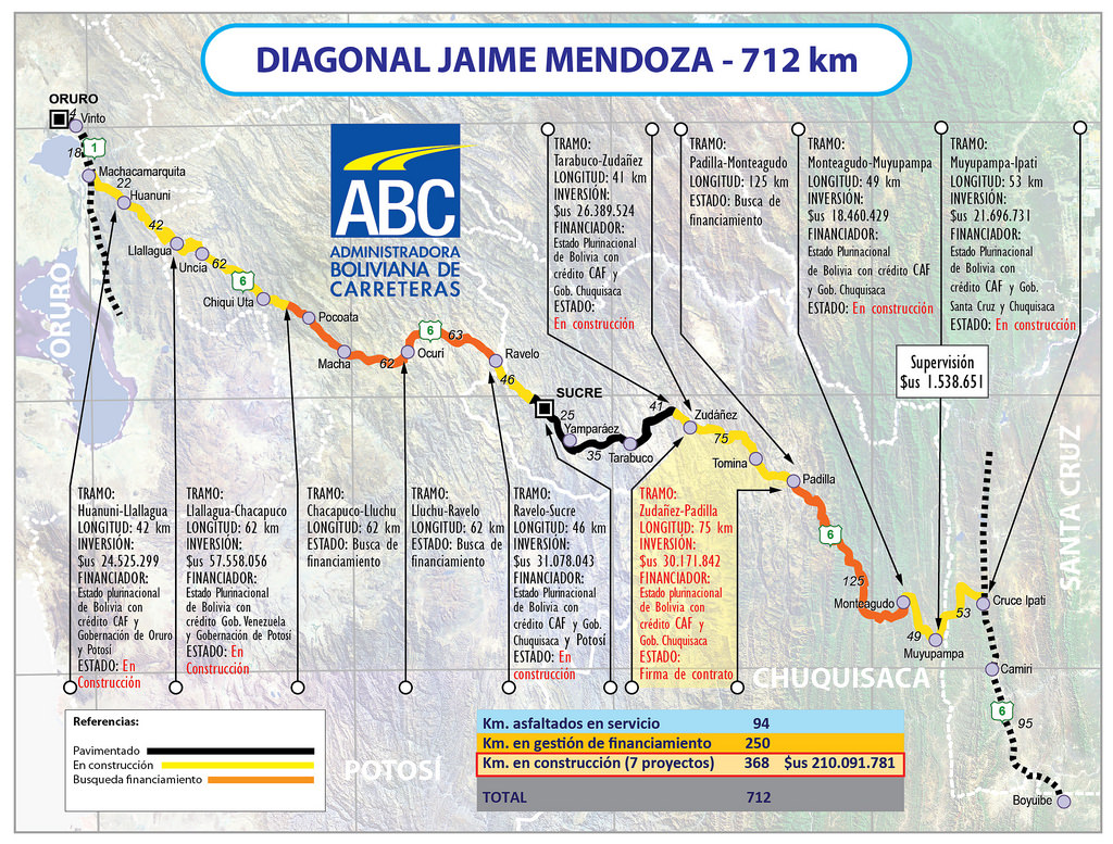Desde 2006 se construyeron más de 240 kilómetros de carretera en este proyecto. Primero fueron los tramos Huanuni-Bombo-Llallagua; Circunvalación-Huanuni; Llallagua-Chacapuco, Chacapuco-Lluchu y Lluchu-Ravelo, según información de la Administradora Boliviana de Carreteras (ABC).