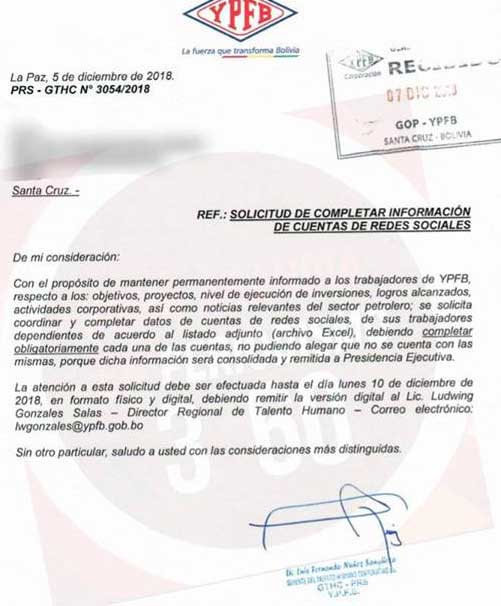 En un instructivo firmado por Luis Nuñez, gerente de Talento Humano de YPFB, se ordena que se llene de manera obligatoria un listado de los trabajadores con sus respectivas cuentas de redes sociales, sin poder allegar que no se tiene las mismas.