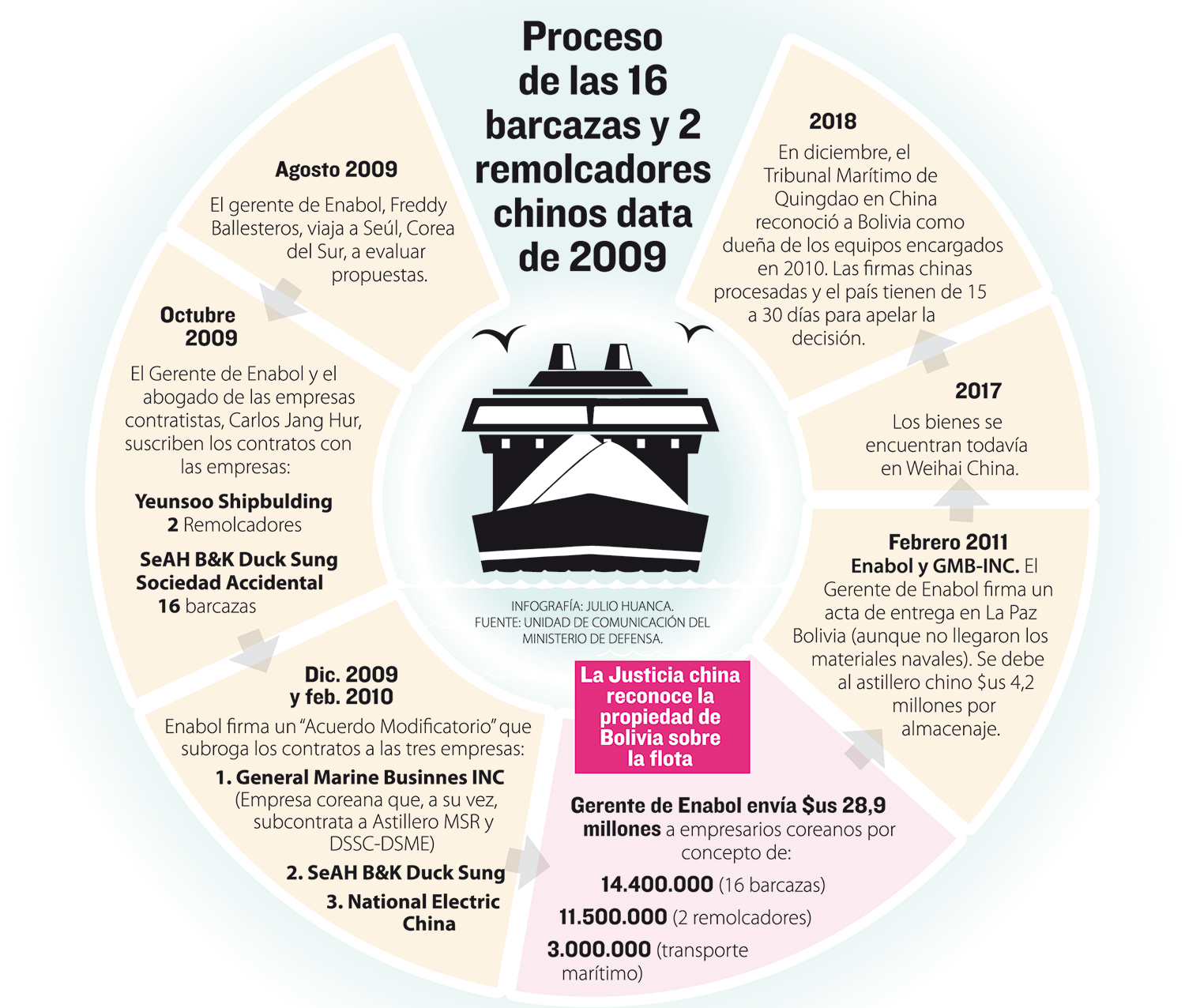 “La noticia llegó en la última quincena de diciembre de 2018. “Hemos sido notificados (con el fallo) y luego procedimos a la traducción del documento (del chino al español) que manifiesta que el derecho propietario de esas barcazas es de Bolivia”, confirmó el ministro de Defensa, Javier Zavaleta.