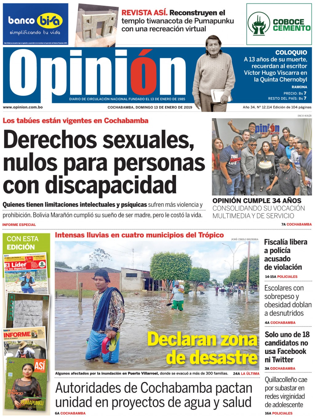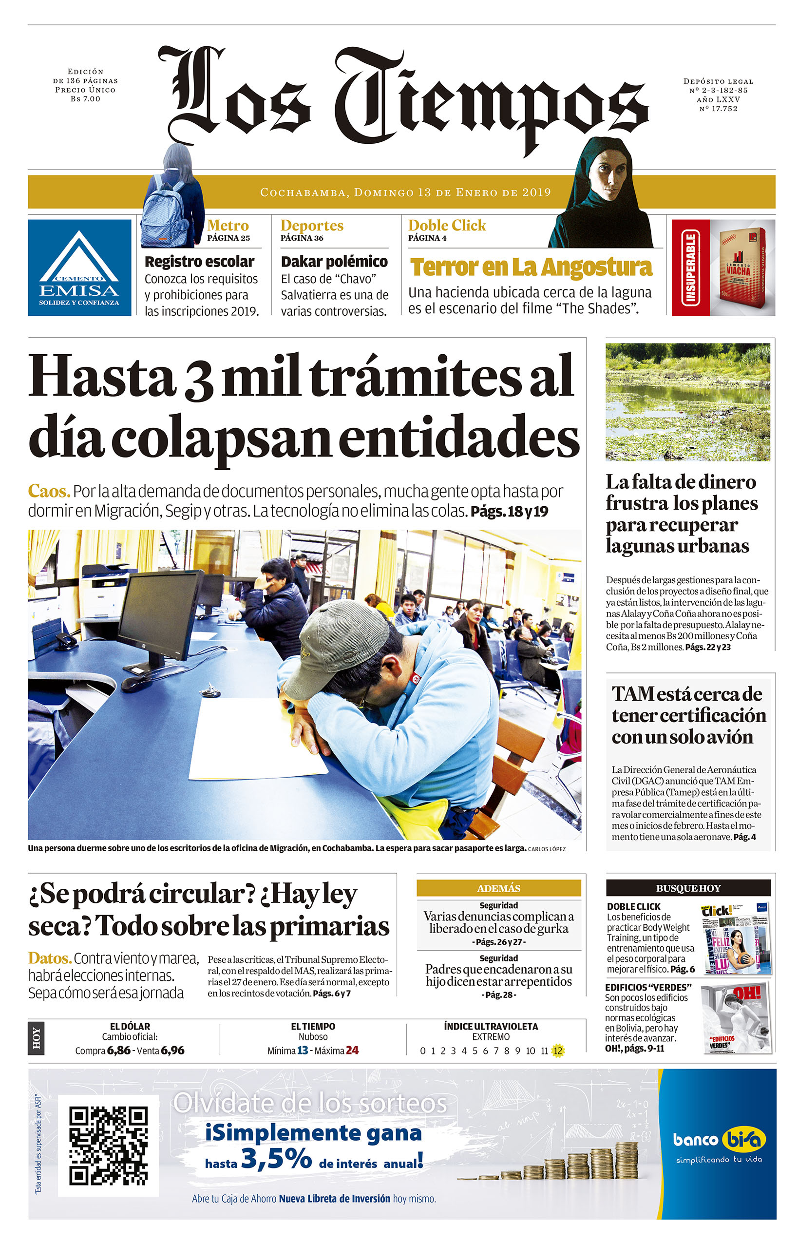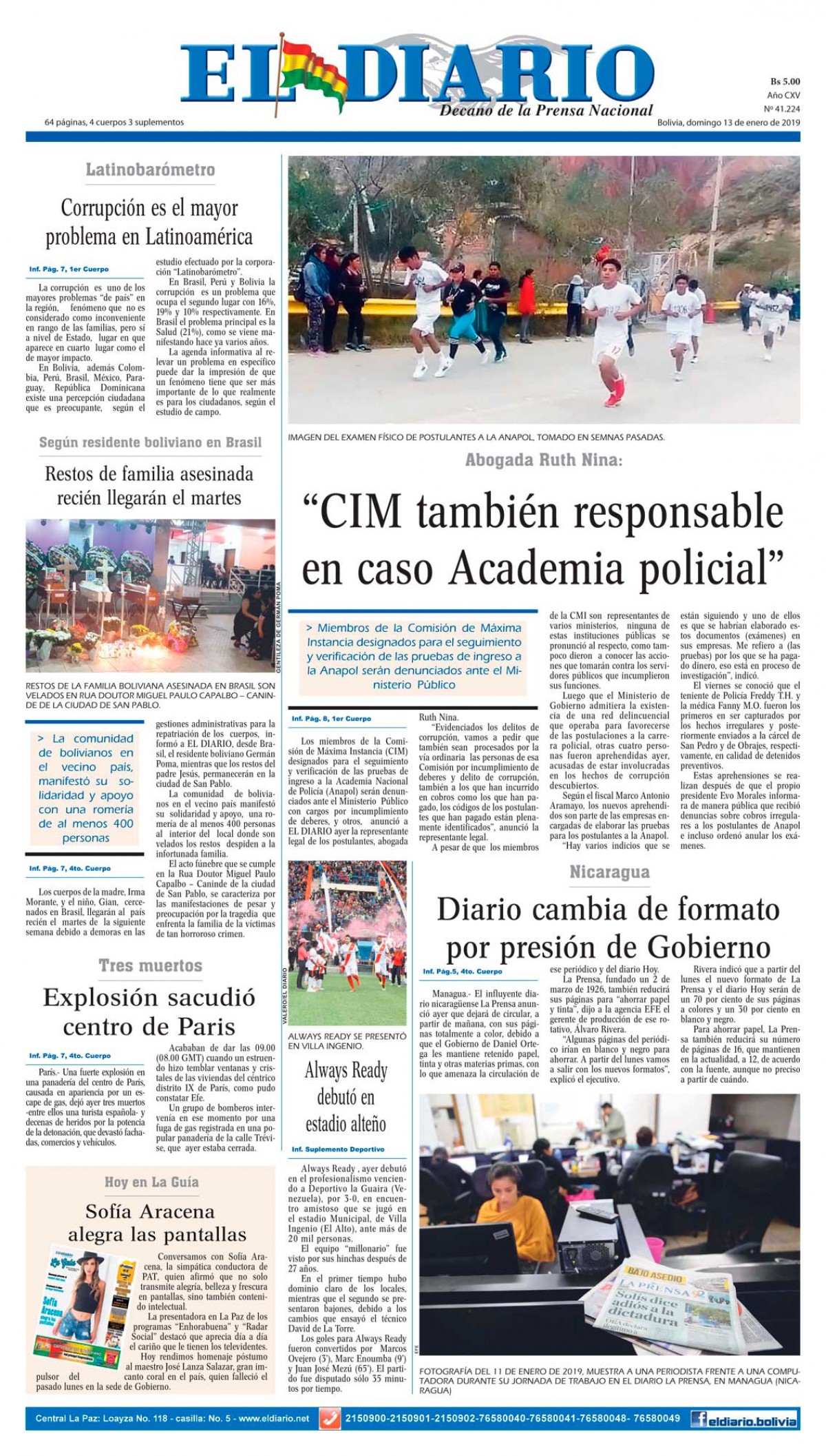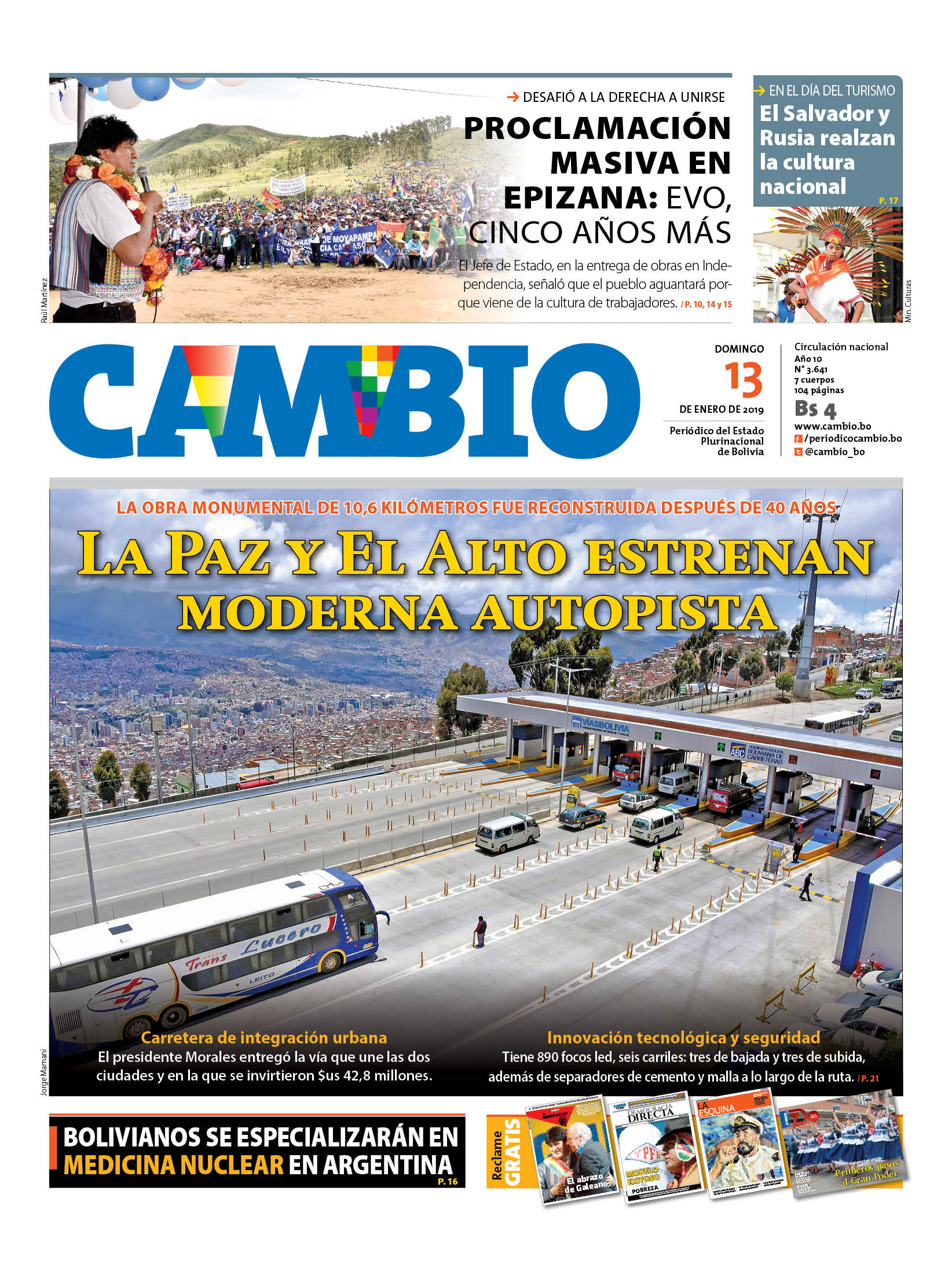 Portadas de periódicos de Bolivia del domingo 13 de enero de 2019