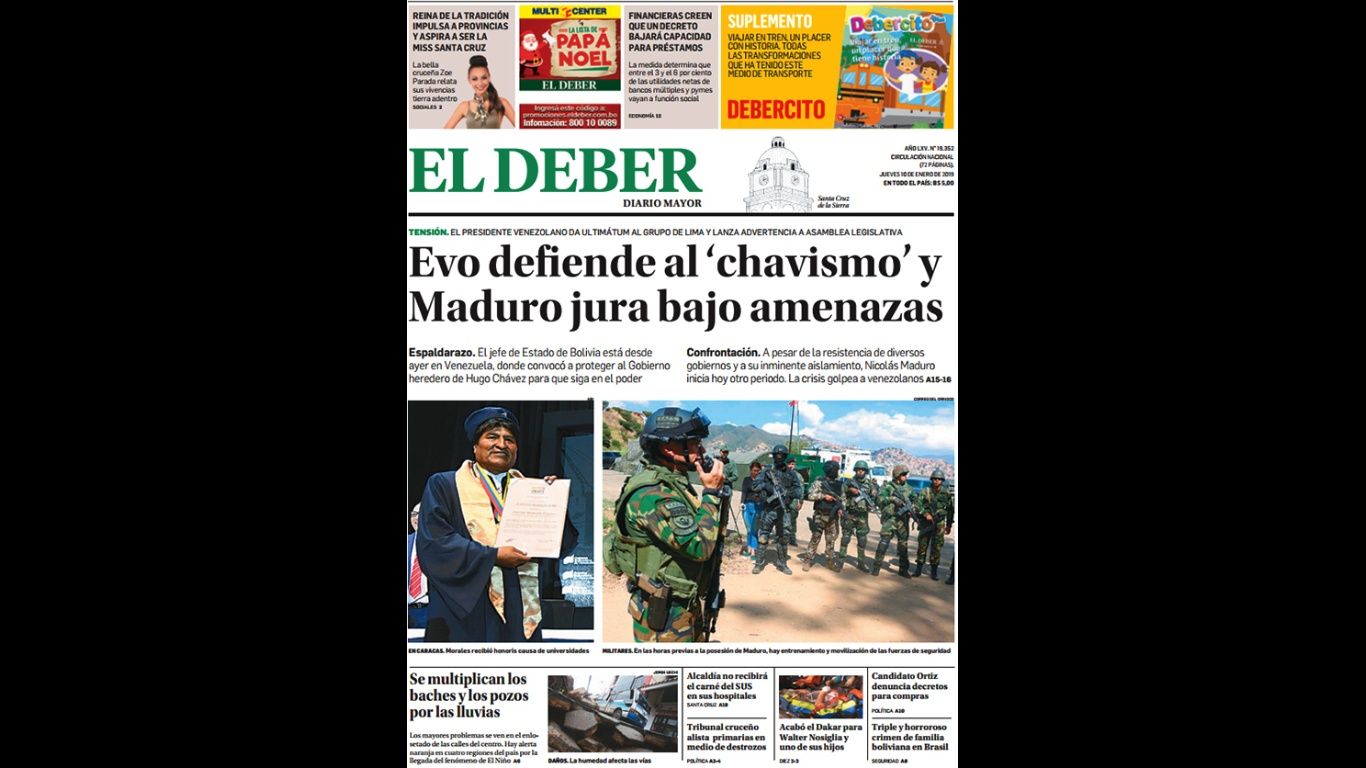 Portadas de periódicos de Bolivia del jueves 10 de enero de 2019