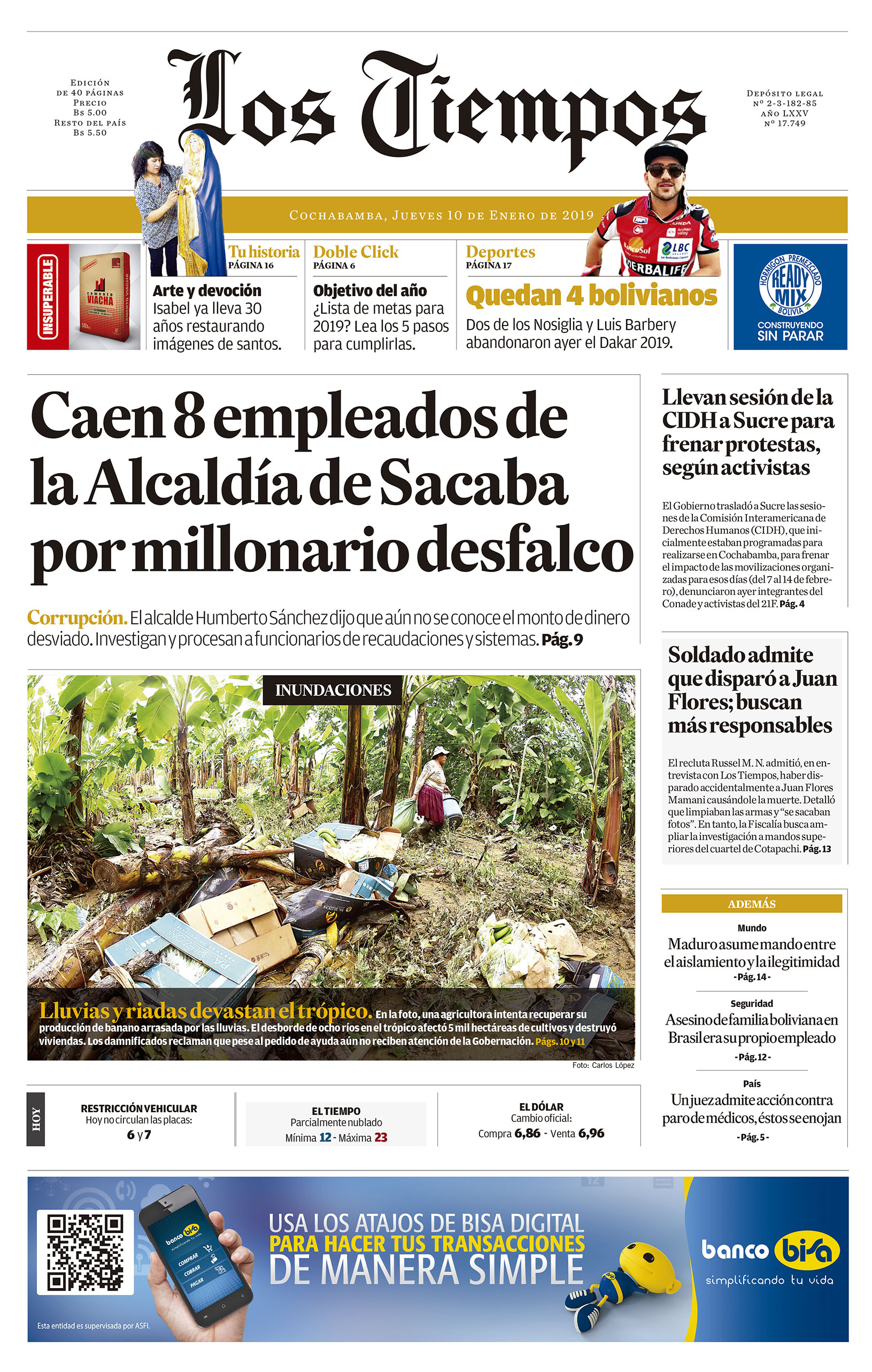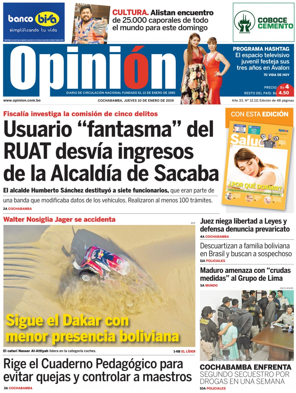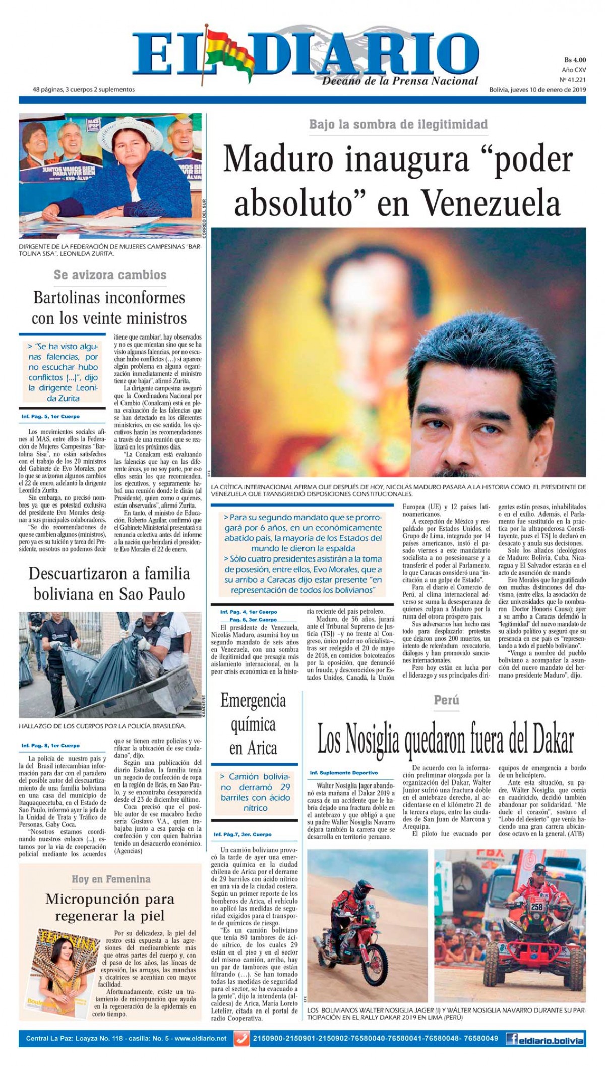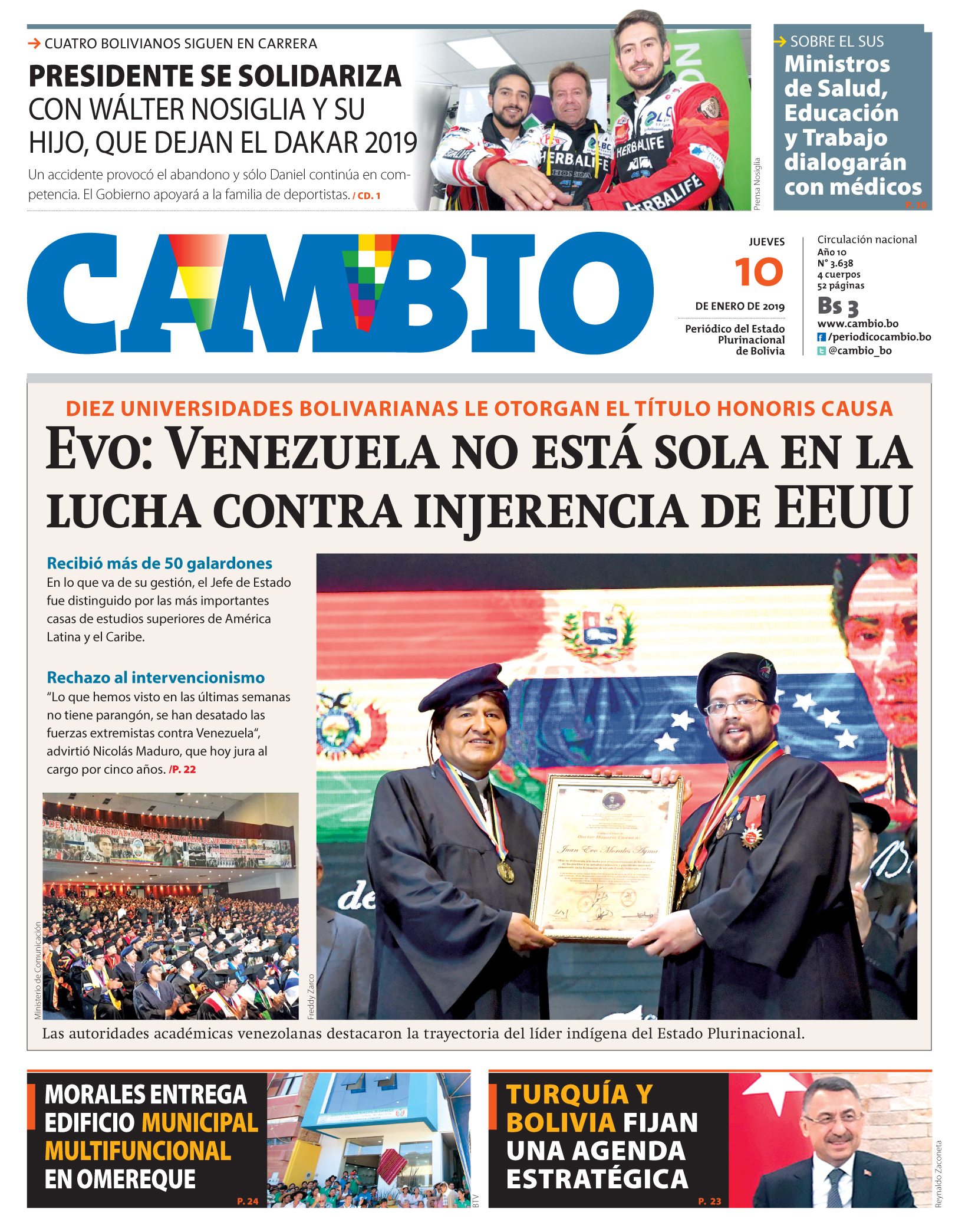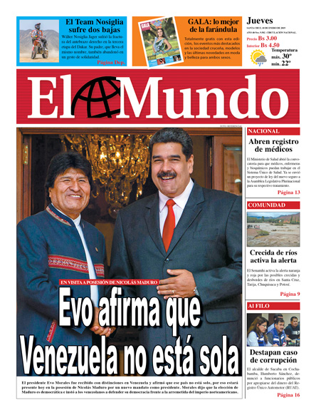 Portadas de periódicos de Bolivia del jueves 10 de enero de 2019