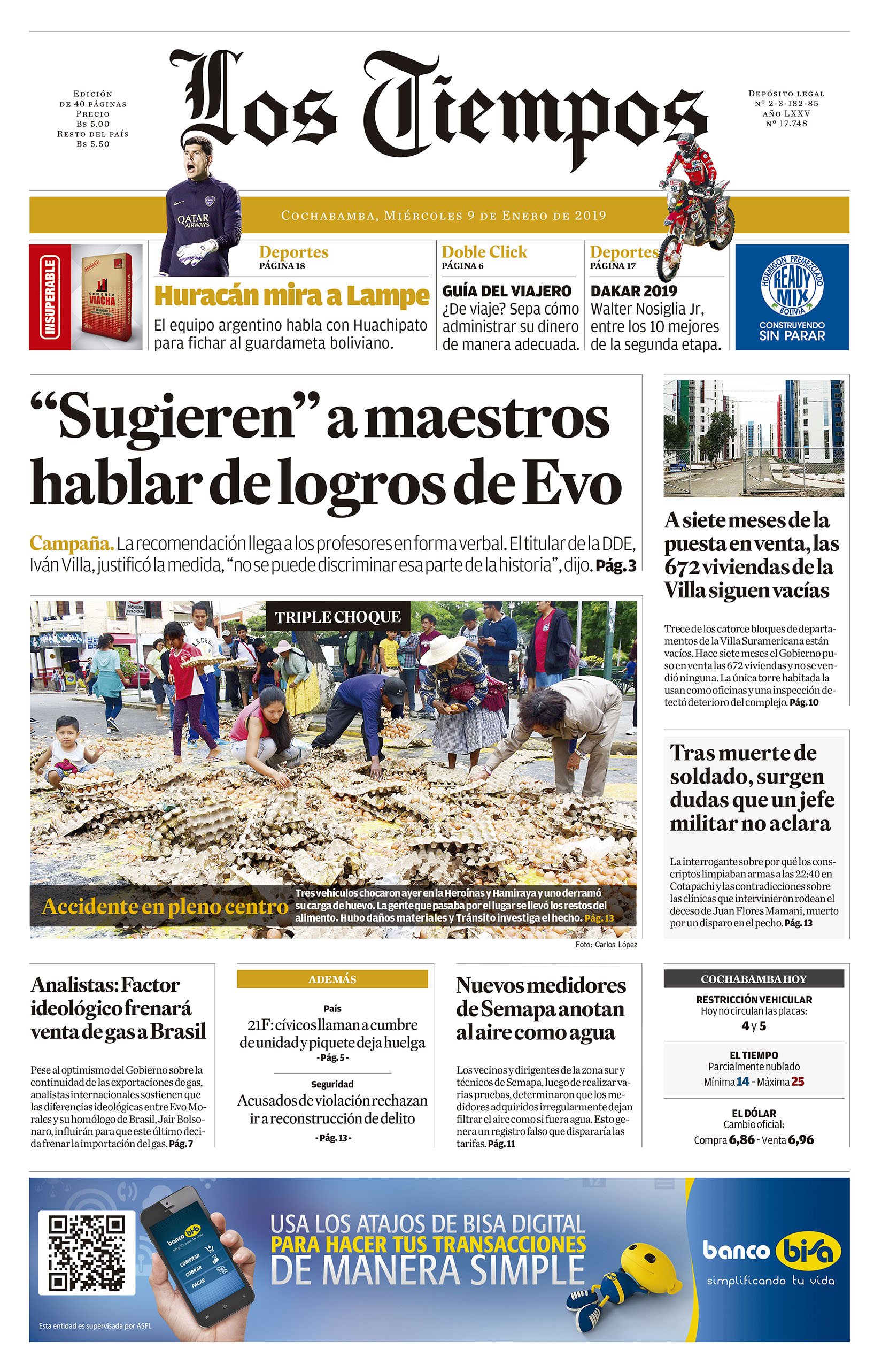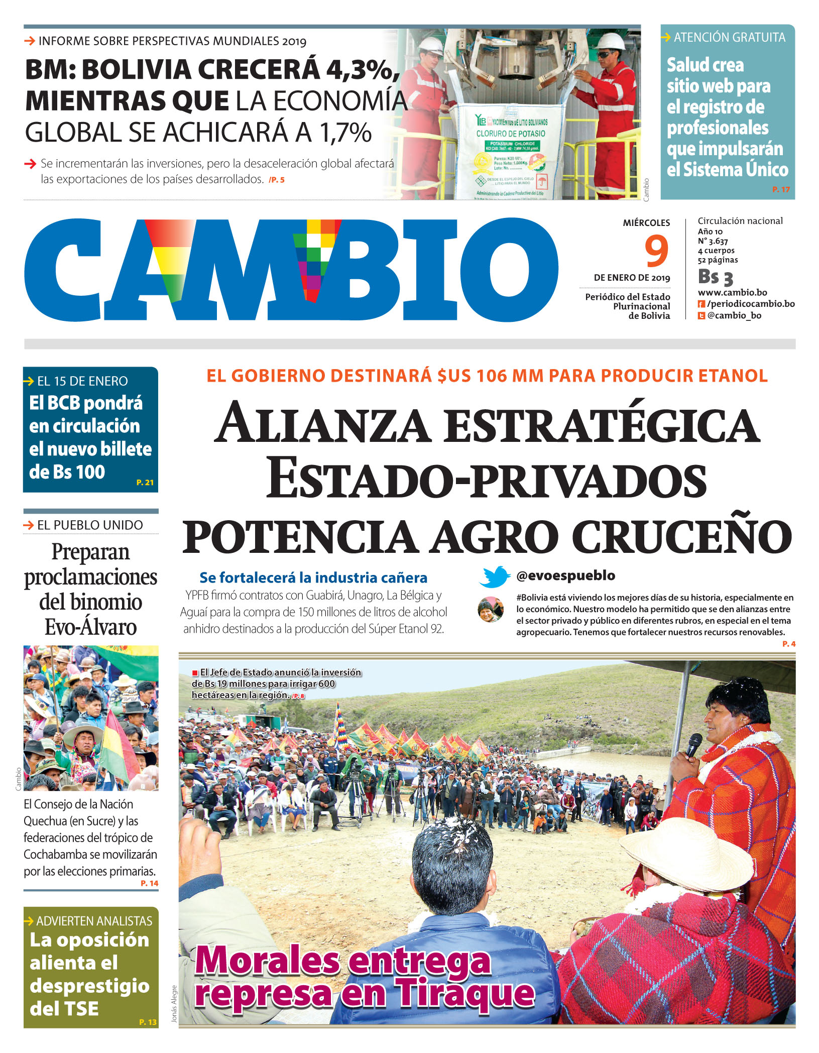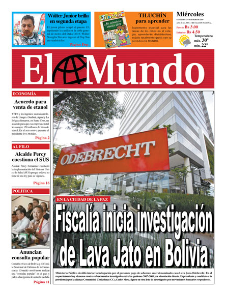 Portadas de periódicos de Bolivia del miércoles 9 de enero de 2019Categorías MonitoreoEtiquetas , Portadas de periódicos 09/01/2019 El Deber – Los Tiempos – El Día – La Razón – Cambio – El Diario – Página Siete – Opinión