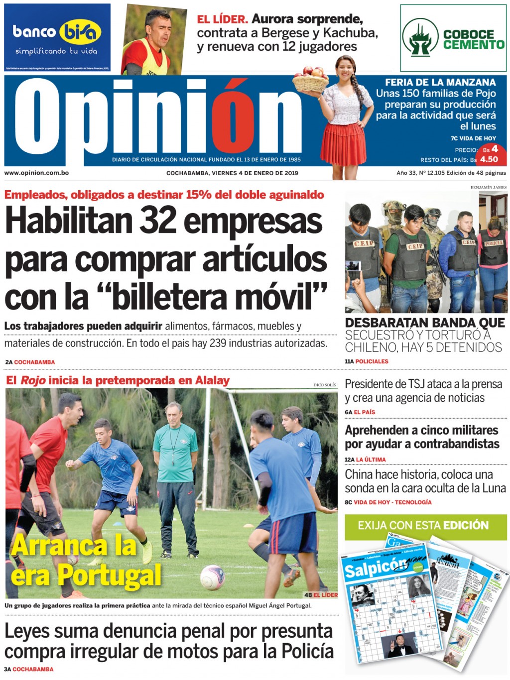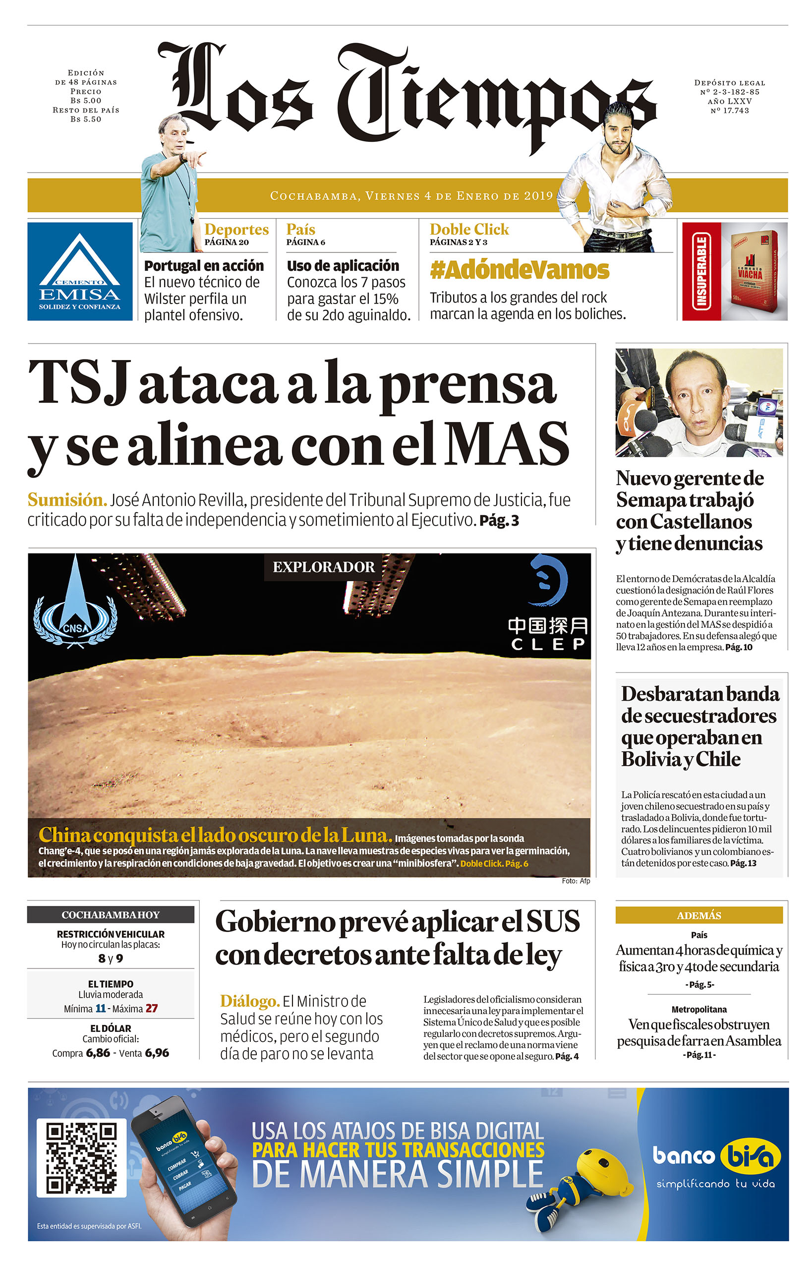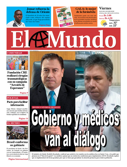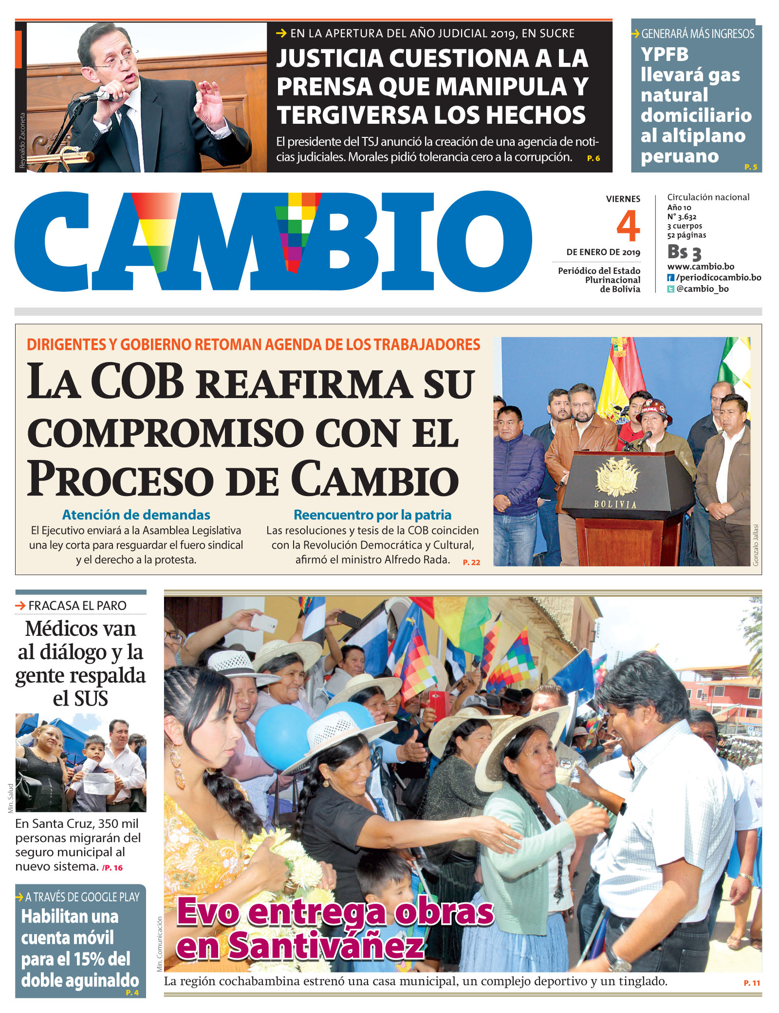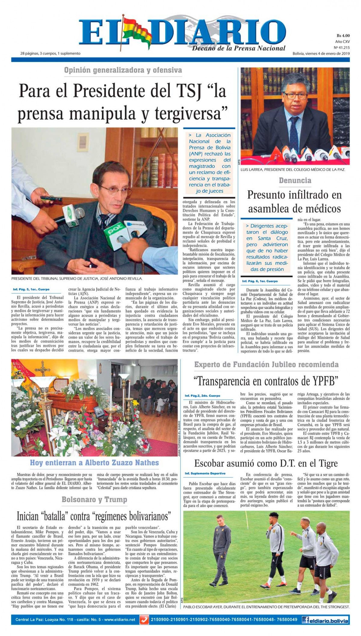 Portadas de periódicos de Bolivia del viernes 4 de enero de 2019Categorías MonitoreoEtiquetas , Portadas de periódicos 04/01/2019 El Deber – Los Tiempos – El Día – La Razón – Cambio – El Diario – Página Siete – Opinión