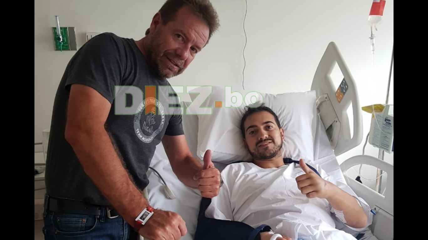 El ‘Lobo del Desierto’ se enteró de que DIEZ está afuera de la clínica y sale a recibirnos. Lo primero que hace es agradecer por la preocupación de la prensa boliviana. Explica que no podemos ingresar, por reglamento interno. Asegura que ahora está feliz, luego del peor susto de su vida. “No sabía qué pensar cuando lo vi en el suelo, inconsciente. Realmente estaba mal”, explica el piloto, que para cuidar a su hijo decidió abandonar el Dakar. La caída se dio en el kilómetro 21 de la tercera etapa, que unía San Juan de Marcona y Arequipa.