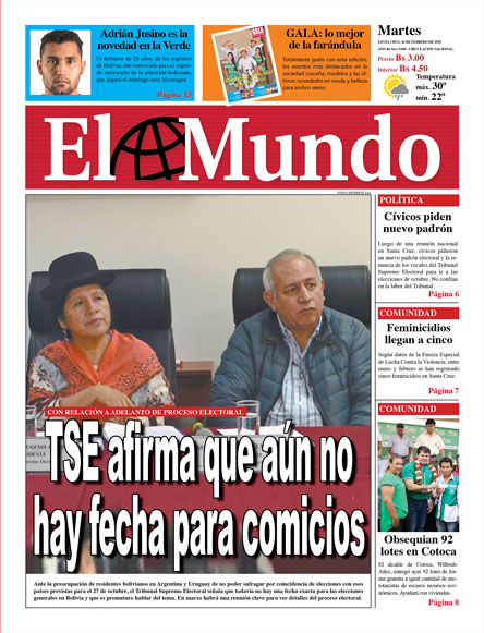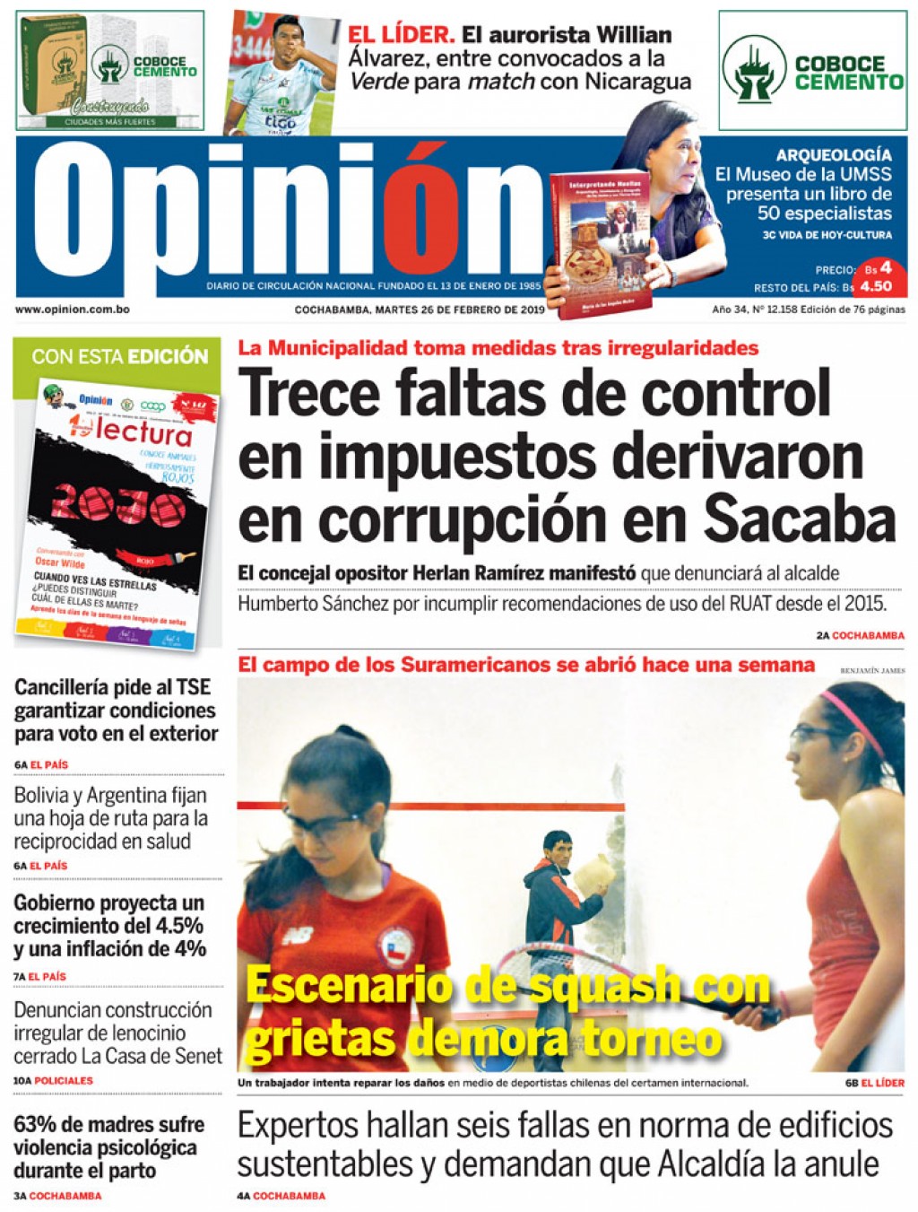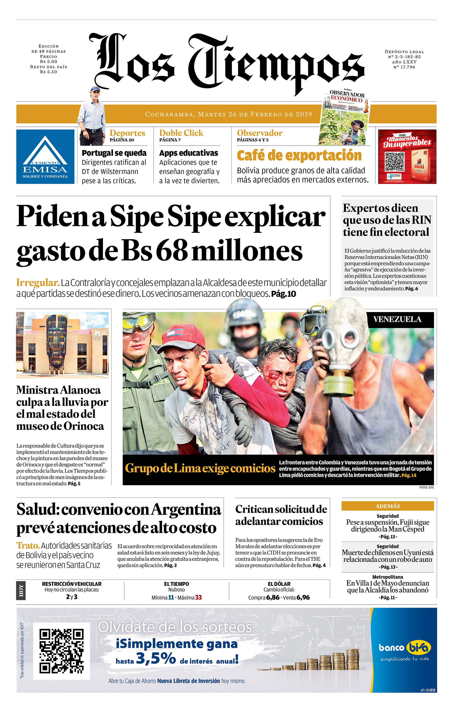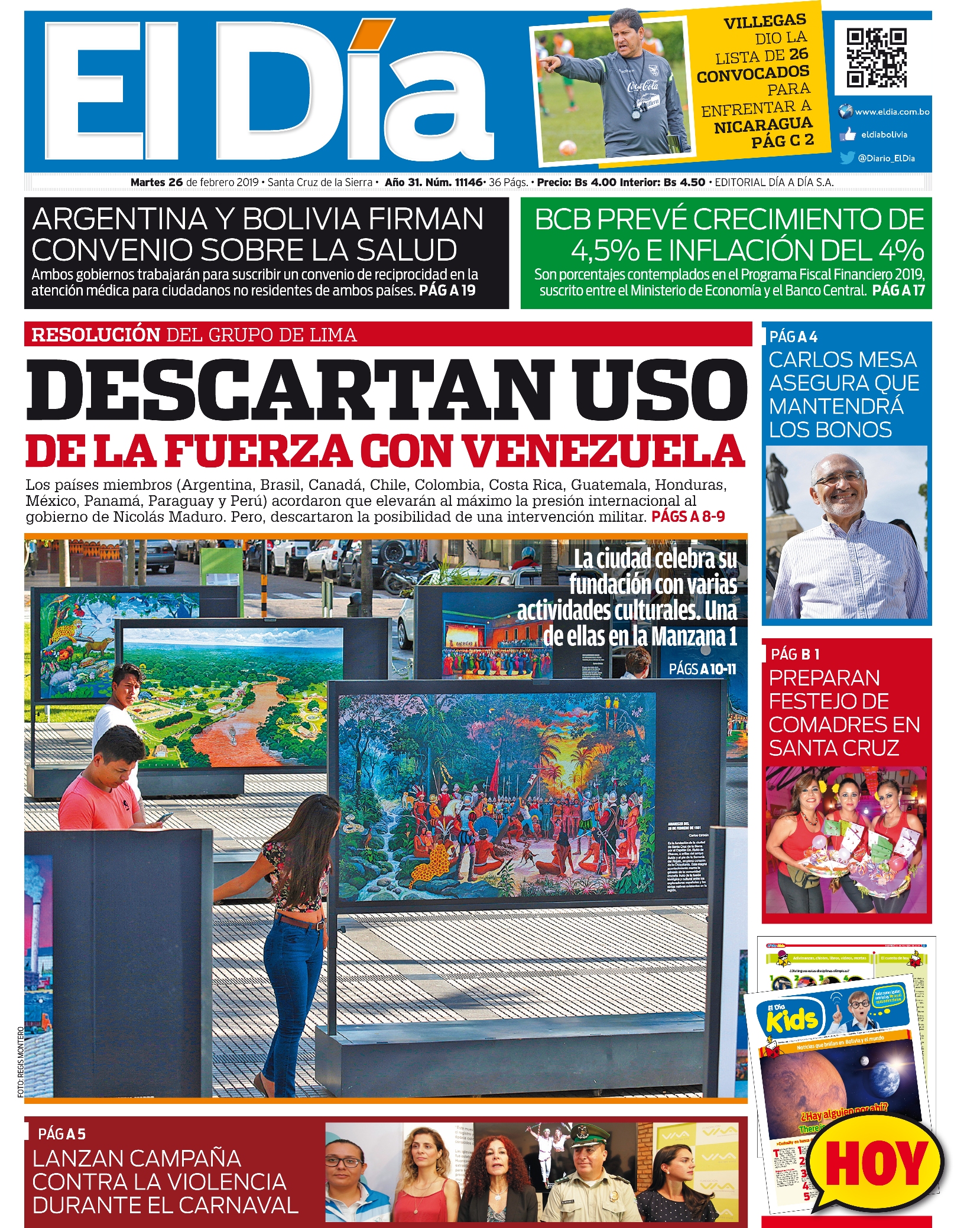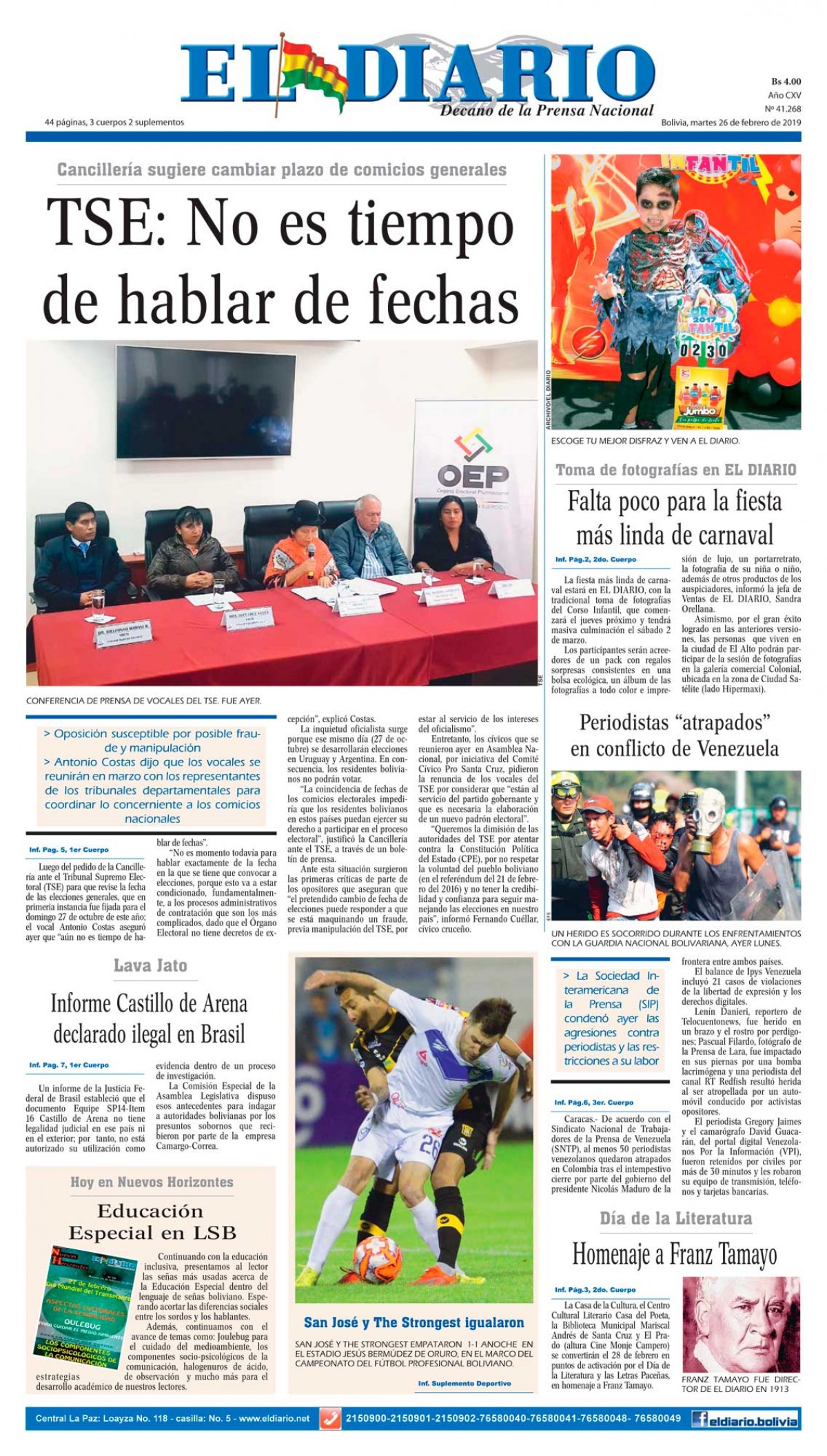 Portadas de periódicos de Bolivia del martes 26 de febrero de 2019Categorías MonitoreoEtiquetas , Portadas de periódicos 26/02/2019 El Deber – Los Tiempos – El Día – La Razón – Cambio – El Diario – Página Siete – Opinión
