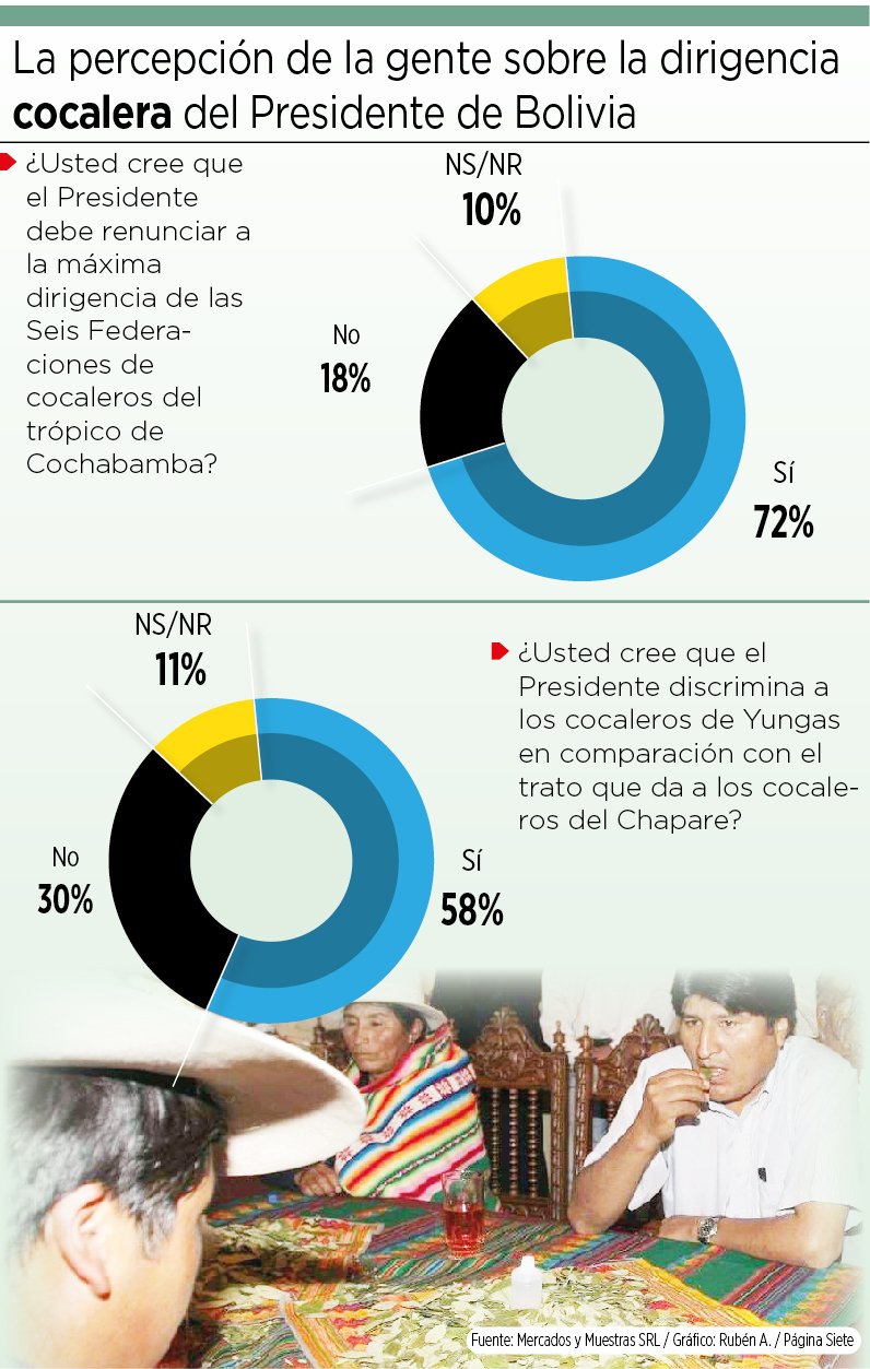 El 72% de las personas encuestadas creen que el presidente Evo Morales debe renunciar a la dirigencia de los cocaleros del Chapare cochabambino, según la reciente encuesta de marzo publicada por Mercados y Muestras.“¿Usted cree que el Presidente debe renunciar a la máxima dirigencia de las Seis Federaciones de cocaleros del Trópico de Cochabamba?, fue la pregunta. El 72% de los encuestados  respondieron que sí debe dimitir, mientras que un 18% opinó que no debe dejar el cargo; un 10% no supo o no respondió a la consulta.A pesar de haber asumido la presidencia de Bolivia en enero de 2006, Morales siempre estuvo vinculado orgánicamente a los sindicatos de cocaleros del Chapare, en los que ingresó por primera vez como secretario de Deportes en 1983.En un congreso de los cocaleros del trópico, realizado en septiembre de 2018, Morales fue ratificado como máximo dirigente de ese sector y surgió la idea de declararlo  líder vitalicio.Sin embargo, parece que a los ciudadanos del resto del país el que Morales sea presidente de la nación y paralelamente dirija a los productores de coca de un sector cuestionado no los convence totalmente.El diputado opositor Tomás Monasterio apunta más a fondo. “El 72% de los encuestados están convencidos de que la fiesta del narcotráfico y el descontrol del Estado es atribuible a que el presidente Morales todavía es dirigente cocalero en el Chapare”.Aseguró que si el Presidente quiere dar señales de disminución del narcotráfico a la comunidad internacional, “debe renunciar a ser líder cocalero”.Yungas, discriminadoLa encuestadora también preguntó: “¿Usted cree que el Presidente discrimina a los cocaleros de Yungas en comparación con el trato que da a los cocaleros del Chapare?”.El 58% de los ciudadanos consultados respondieron que Morales efectivamente discrimina a los productores paceños, el 30% considera que no hay discriminación y el 11% no supo o no respondió a la pregunta.Las fricciones recurrentes del Gobierno con la dirigencia de cocaleros paceños, emboscadas,  muertos y la detención de su máximo dirigente Franclin Gutiérrez, son las razones por las que este sector percibe “un trato desigual”, como sostiene Sergio Pampa, uno de sus líderes.El año pasado, tras la muerte de tres cocaleros en La Asunta, este sector pidió incluso la renuncia del Presidente.Fuente: www.paginasiete.bo
