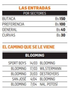 Si Blooming hoy logra sumar de a tres se abrirá un buen panorama ya que después del partido con The Strongest, no saldrá de la ciudad ya que debe enfrentarse el miércoles a Sport Boys en Warnes, en la fecha 12, seguir con Wilstermann el próximo domingo en la 13, para cerrar en casa ante Destroyers en la 14 antes de que se pare el torneo por el microciclo de la selección. Recién saldrá de Santa Cruz para visitar a San José el 4 de abril en la fecha 15.