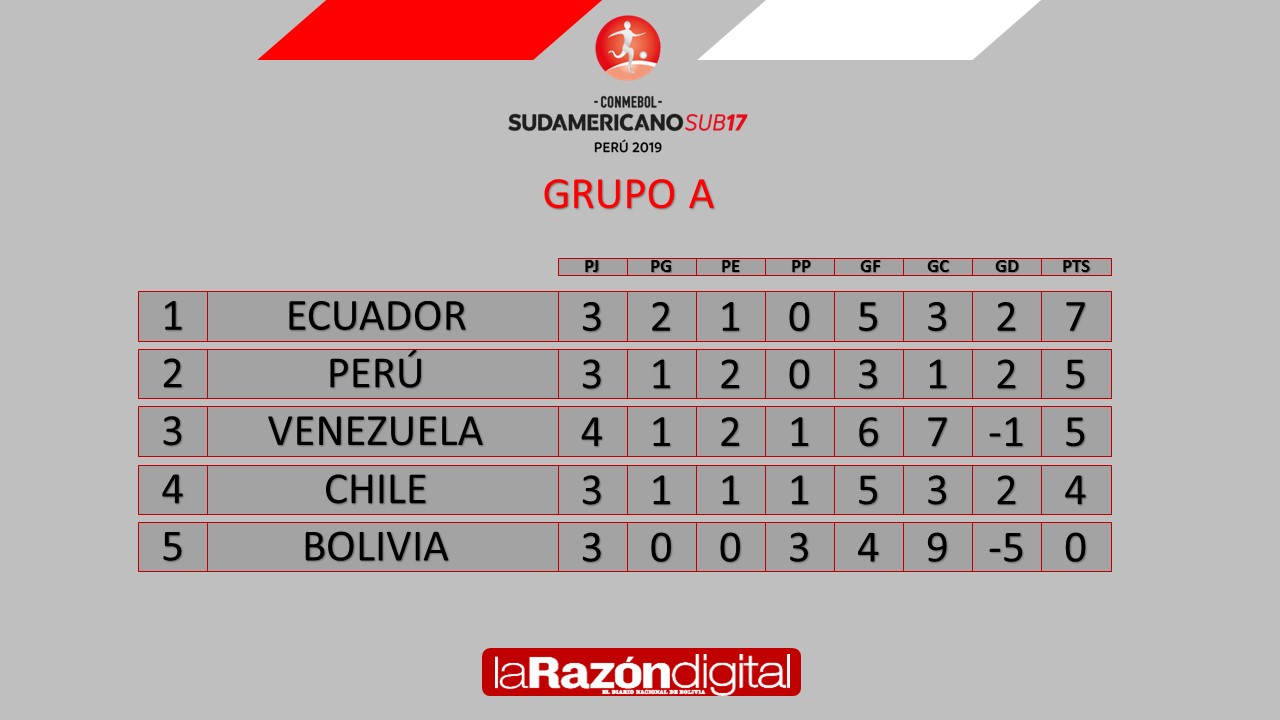La selección boliviana juega este viernes su último partido por la fase de grupos del campeonato Sudamericano Sub-17 de Perú enfrentando a Chile desde las 18.10, por la serie A, en el estadio San Marcos de la capital peruana. Con tres derrotas consecutivas la “Verdecita” va por el triunfo y el honor.
