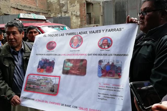 El 5 de febrero, el diputado Wilson Santamaría (UD) denunció que de 2009 a 2017 la empresa Vías Bolivia transfirió Bs 11,9 millones a cuentas particulares de dirigentes de la Federación de Chóferes 1 de mayo para un fondo de salud. La Fiscalía investiga el caso.Oxígeno / La Paz