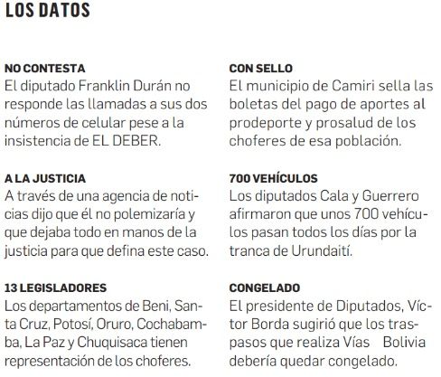 Pero los diputados Juan Cala y Mario Guerrero informaron que en Camiri existe un cobro superior al de La Paz. Según Cala, los funcionarios de la Alcaldía de Camiri cobran Bs 2 para el prodeporte del municipio y Bs 1 para el “prosalud de los transportistas”.