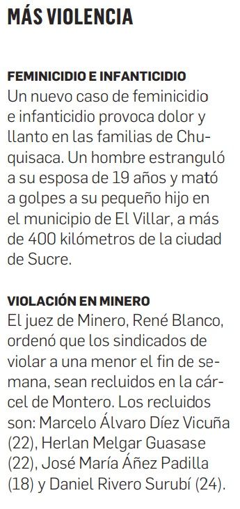 Entre los hechos que golpearon a los cruceños, está la violación grupal de una adolescente de 15 años en Minero, el abuso a una niña de 12 años que resultó embarazada por el ultraje de su hermano y su tío, la violación de una adolescente a manos de su novio y otros sujetos, y ayer se conoció el abuso al que fueron sometidas dos adolescentes de 13 años en el municipio de Warnes.
