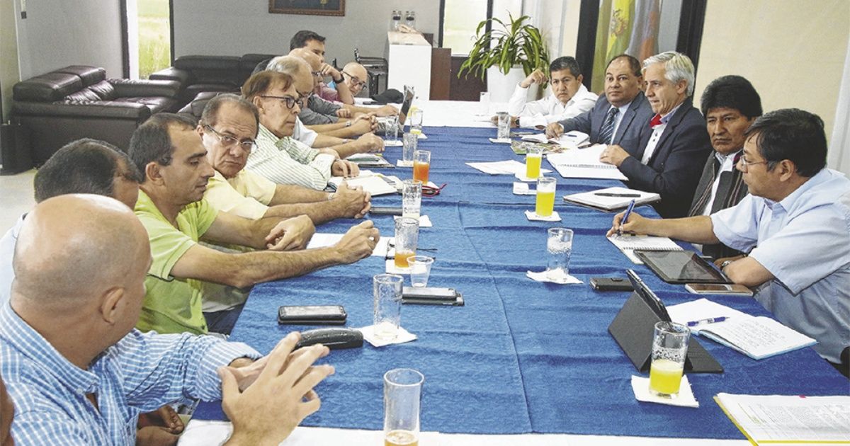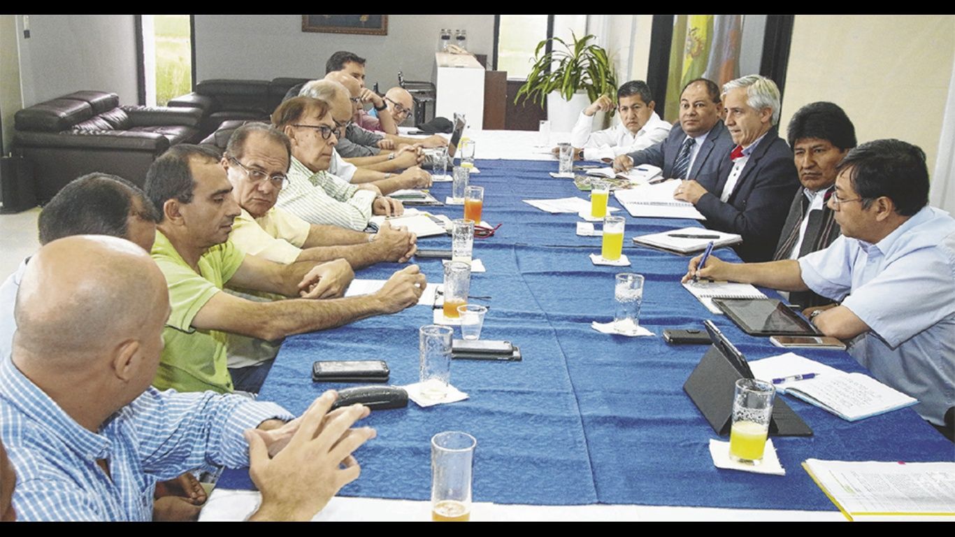 El principio de acuerdo se generó en la reunión que se desarrolló en el hangar presidencial de Viru Viru en la que participó Evo Morales, jefe de Estado, Álvaro García Linera, vicepresidente, los ministros del área económica y los principales representantes del sector privado.