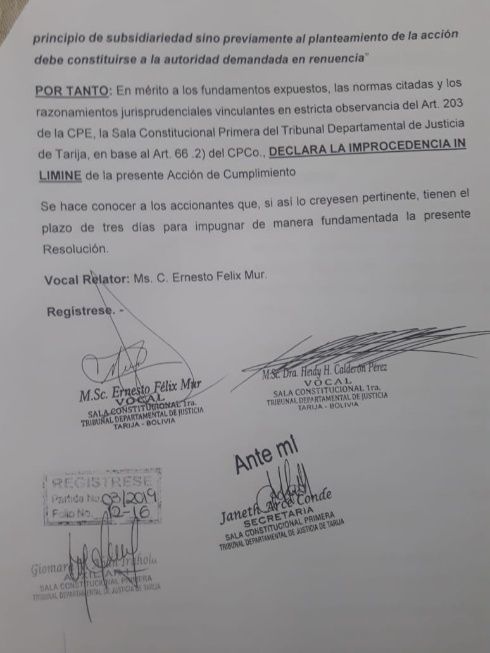 “En mérito a los fundamentos expuestos, las normas citadas y los razonamientos jurisprudenciales vinculantes en estricta observancia del artículo 203 de la CPE, la Sala Constitucional Primera del Tribunal Departamental de Justicia de Tarija declara la improcendencia in limine de la presente Acción de Cumplimiento”, dice textualmente el fallo que lleva la firma de los vocales Ernesto Mur y Heidy Calderón.