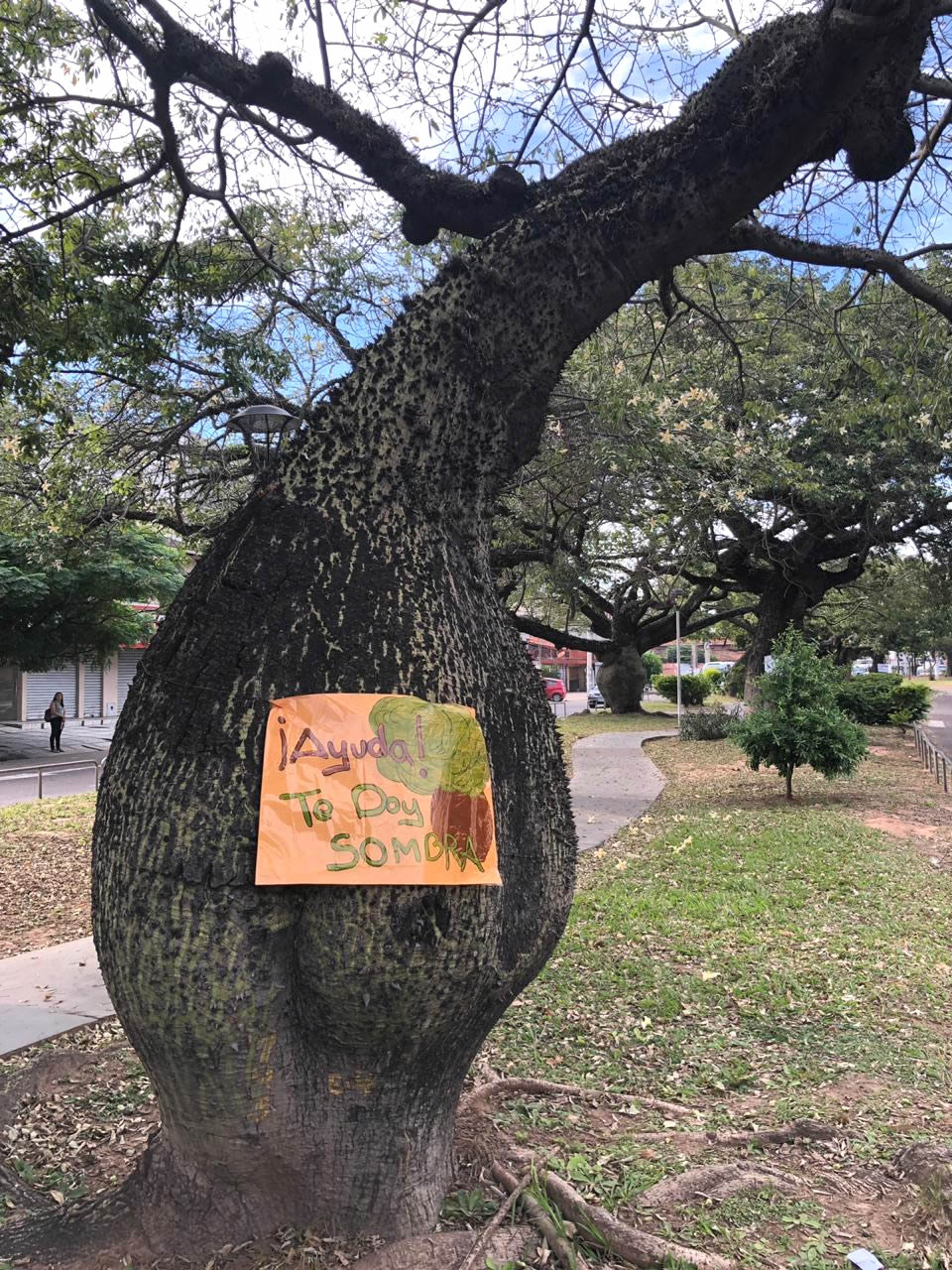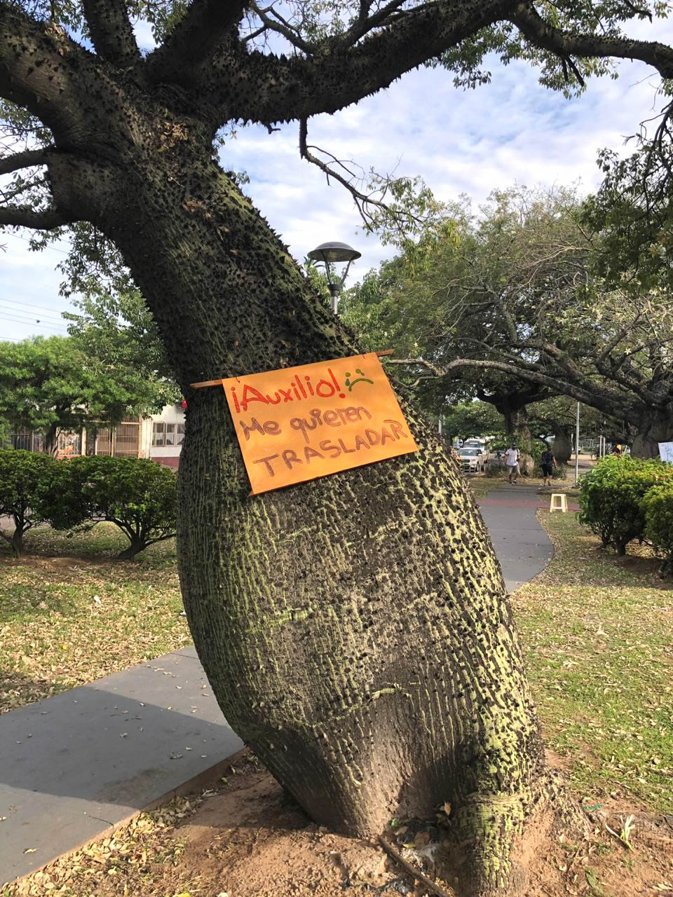 Este sábado pasó algo inusual en la zona del Avión Pirata, primer anillo de la capital cruceña. Los imponentes toborochis, de más de 15 metros de altura, aparecieron con carteles en los que ‘le piden’ a la ciudadanía hacer fuerza para evitar que sean talados o removidos de ese lugar.
