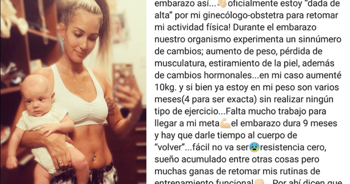 «Oficialmente estoy ‘dada de alta’ para retomar mi actividad física. Durante el embarazo nuestro organismo experimenta muchos cambios; aumento de peso, pérdida de musculatura, estiramiento de la piel y alteraciones hormonales. Yo aumenté 10 kg. Si bien ya estoy en mi peso, fueron cuatro meses sin realizar ningún tipo de ejercicio…», compartió la exmodelo.