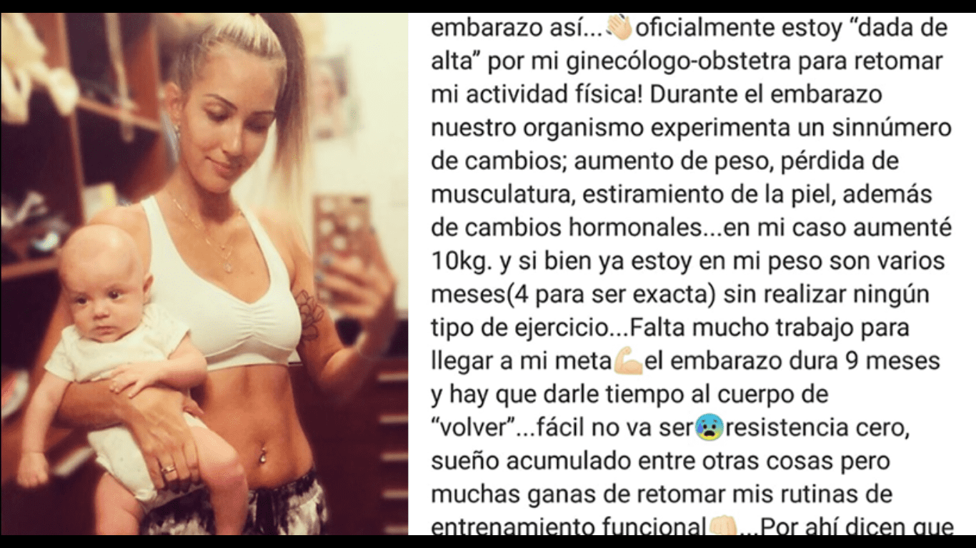 «Oficialmente estoy ‘dada de alta’ para retomar mi actividad física. Durante el embarazo nuestro organismo experimenta muchos cambios; aumento de peso, pérdida de musculatura, estiramiento de la piel y alteraciones hormonales. Yo aumenté 10 kg. Si bien ya estoy en mi peso, fueron cuatro meses sin realizar ningún tipo de ejercicio…», compartió la exmodelo.