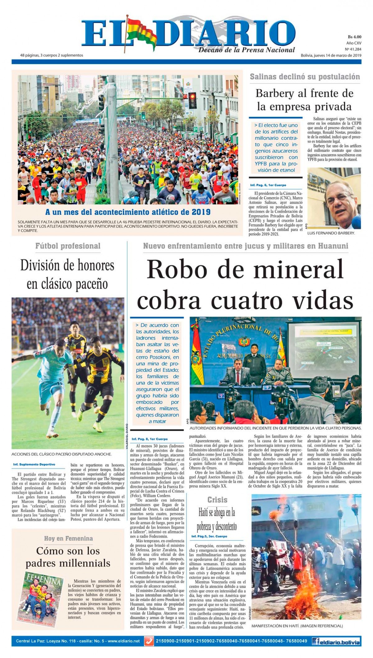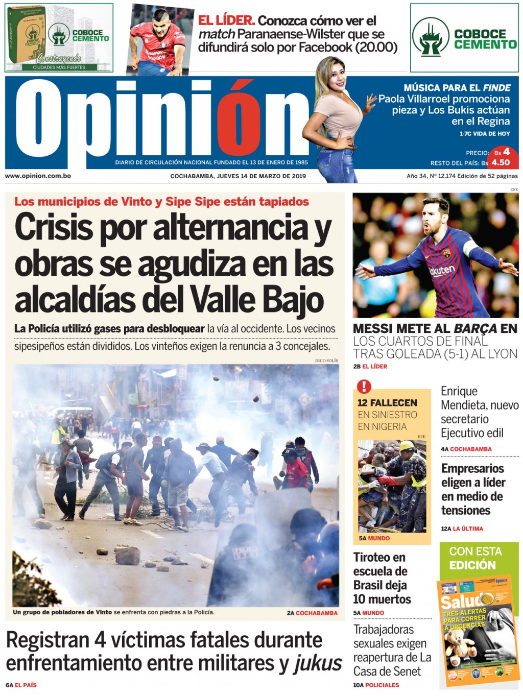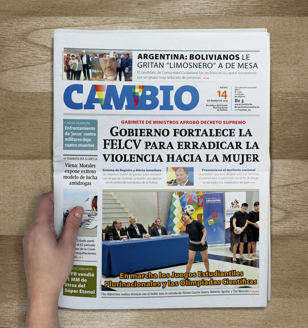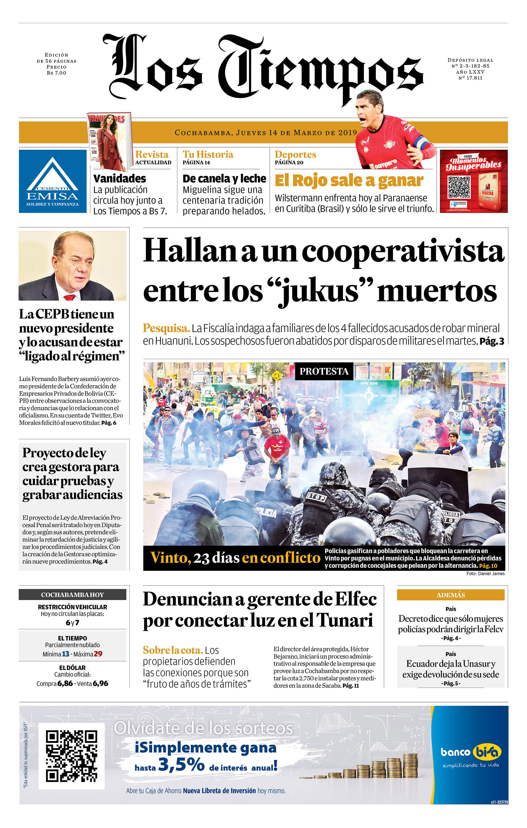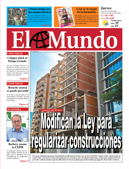Portadas de periódicos de Bolivia del jueves 14 de marzo de 2019Categorías MonitoreoEtiquetas , Portadas de periódicos 14/03/2019 El Deber – Los Tiempos – El Día – La Razón – Cambio – El Diario – Página Siete – Opinión