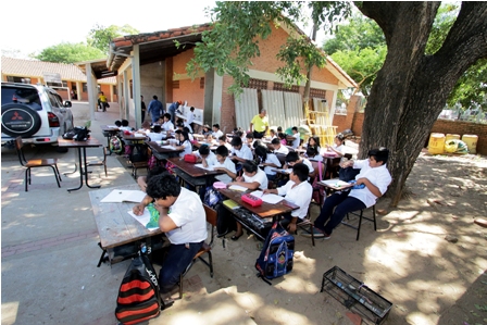 Ref. Fotografia: Afectados. Para evitar los malos olores los estudiantes pasan clases bajo un árbol.