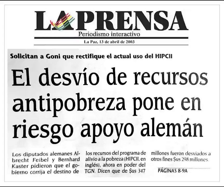 Como hoy, 2003, se informó que #Alemania exigió a Goni y Carlos de Mesa que reviertan el desvío de recursos de la cooperación destinados a la lucha contra la pobreza, que ellos habían empleado en otros rubros. Tienen en la conciencia el haberle quitado dinero a los más humildes. https://t.co/olDKnng7iK