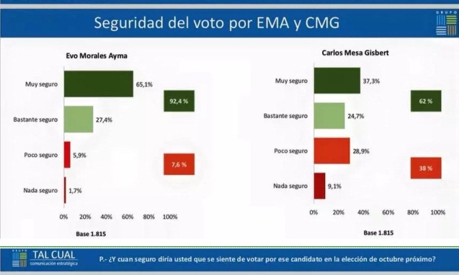 Casi un 40% de quienes respaldan al ex presidente podrían cambiar su voto Un nuevo sondeo de intención de voto realizado por la encuestadora Tal Cual, difundido en las redes sociales por el periodista Tuffí Aré, pone en evidencia la fragilidad del respaldo electoral a Carlos Mesa.El estudio, con una muestra de 1.815 casos, indica que un 38% de la intención de voto por el postulante de Comunidad Ciudadana es altamente volátil, por lo que podría migrar fácilmente a otra fuerza política. Un 28,9% del apoyo a Mesa es calificado como “poco seguro” y un 9,1% como “nada seguro”.En suma, casi 4 de cada 10 personas que respaldan al ex presidente podrían cambiar su voto.