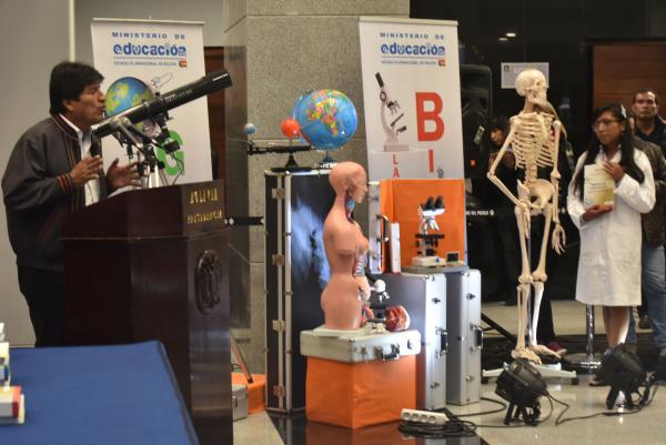 El presidente Evo Morales entregó hoy laboratorios de física, química, biología y geografía a 1.800 unidades educativas en el nivel secundario cuya inversión asciende a Bs 98.7 millones.El ministro de Educación, Roberto Aguilar, explicó que los laboratorios de física constan de kits de Mecánica I y II, y Óptica; y kits de Electricidad y Calor (Electrostática, Electricidad, Magnetismo y Calor).“Los laboratorios de química tendrán kits de Química I, II y III, en tanto que los de biología y geografía cuentan con microscopiosópticos monoculares, microscopios estéreos, telescopios, esqueleto humano, torso humano bisexo, extintor cargado de polvo químico, kit de biología, modelo anatómico cuerpo humano, modelo anatómico de oído y ojo humano, modelos del sistema solar, fases de la luna y globos terráqueos”, detalló.El presidente Evo Morales destacó que esta entrega es un esfuerzo del Gobierno central para el desarrollo del pueblo boliviano.“La educación es sinónimo de liberación y en estos nuevos tiempos necesitamos científicos para la liberación tecnológica. Debemos seguir mejorando la educación, tenemos mucha esperanza en las nuevas generaciones”, expresó.Asimismo indicó que la meta del Ejecutivo es llegar a las más de 4.648 unidades educativas de secundaria con laboratorios, ya que posibilita que los estudiantes complementen su aprendizaje teórico con la práctica.“Ahora las nuevas construcciones educativas deben tener ambientes para talleres y laboratorios, y en las escuelas antiguas que no tienen esos ambientes, las alcaldías deben comenzar a construir estos ambientes para equiparlos”, aseveró.A su turno, Freddy Mamani, ejecutivo de Confederación de Maestros de Educación Rural, agradeció a Morales por esta entrega y por los esfuerzos que hace el Gobierno central en educación, ya que es el segundo país en la región que más invierte en este sector después de Cuba.“La lucha no ha sido en vano. Antes veíamos estos materiales (de laboratorio) en textos, en libros, ahora los tenemos físicamente. Ahora los estudiantes deben responder a la necesidad del pueblo boliviano”, manifestó.La estudiante Gisela Carlo, ejecutiva nacional de la Confederación de Estudiantes de Secundaria, agregó que ahora no habrá escusas para que los alumnos de este nivel no puedan rendir al máximo y explotar sus capacidades.“Con este equipamiento podremos prepararnos para competir en concursos internacionales”, acotó.Cambio Digital