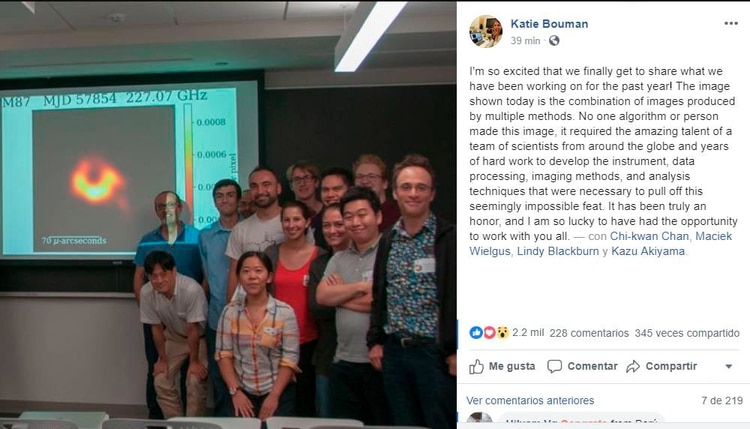 Pero en su cuenta de Facebook se negó a tomar el crédito y explicó que la primera foto del agujero negro fue un trabajo en equipo.
