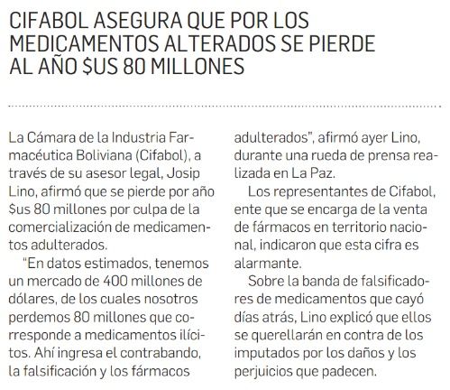 El jefe de la Felcc de La Paz está al frente de las pesquisas. Según las instituciones que aglutinan a los farmaceúticos, se pierde por año alrededor $us 80 millones. Los remedios falsos llegaron a más ciudades
