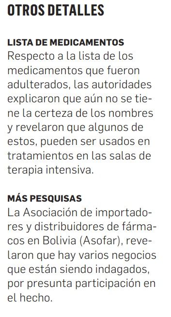 “Estamos completamente seguros de que estos medicamentos llegaron hasta Santa Cruz, por eso le pedimos a toda la población tener cuidado. La investigación tiene que ampliarse hasta el interior del país, tenemos datos que hay una comercializadora que se encargaba de comprar y luego vender en otros departamentos estos fármacos adulterados”, afirmó Guarachi.