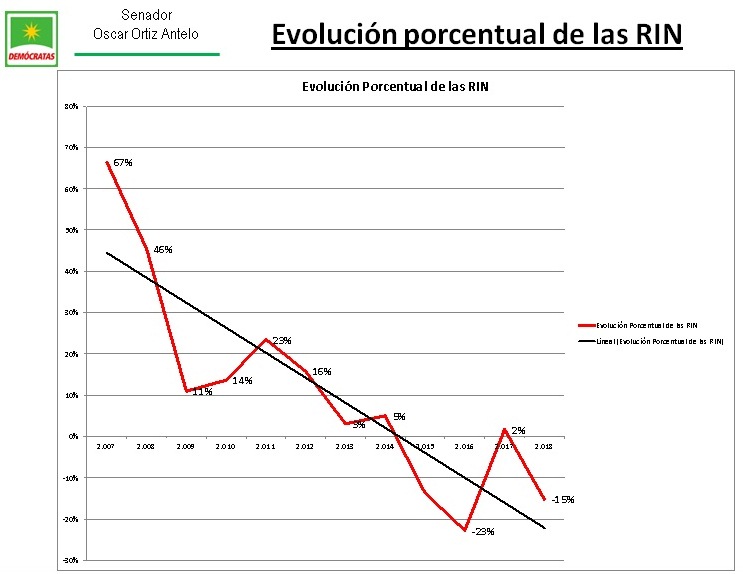 El senador Demócrata y candidato presidencial por la alianza Bolivia Dice No, Oscar Ortiz, presentó un estudio sobre la acelerada disminución de las Reservas Internacionales Netas (RIN) del país; que de un máximo de 15 mil millones dólares el 2015 han bajado a 7.917 millones a marzo de 2019. “En cuatro años bajamos 7 mil millones de dólares y en solo cuatro meses de 2019 ya bajaron 1000 millones de dólares. Un dato importante es que de estos 7917 millones que tenemos hoy de reservas, 5896 millones son divisas, que es lo que realmente se puede utilizar y 1783 es oro, todos sabemos que un país no utiliza sus reservas de oro porque ya sería un caso de catástrofe”, explicó el legislador opositor. Del mismo modo, explicó que otro tema de preocupación es el “Portafolio de Liquidez”, que es lo que realmente está disponible para ser utilizado en cualquier momento para sostener eventuales problemas de la economía nacional, el mismo que ha bajado de 4550 millones de dólares a fines del año 2017 a solo 3336 millones de dólares a fines de 2018. “Es decir, el tramo de liquidez ha disminuido más de 1200 millones de dólares en un año”, detalló Ortiz.