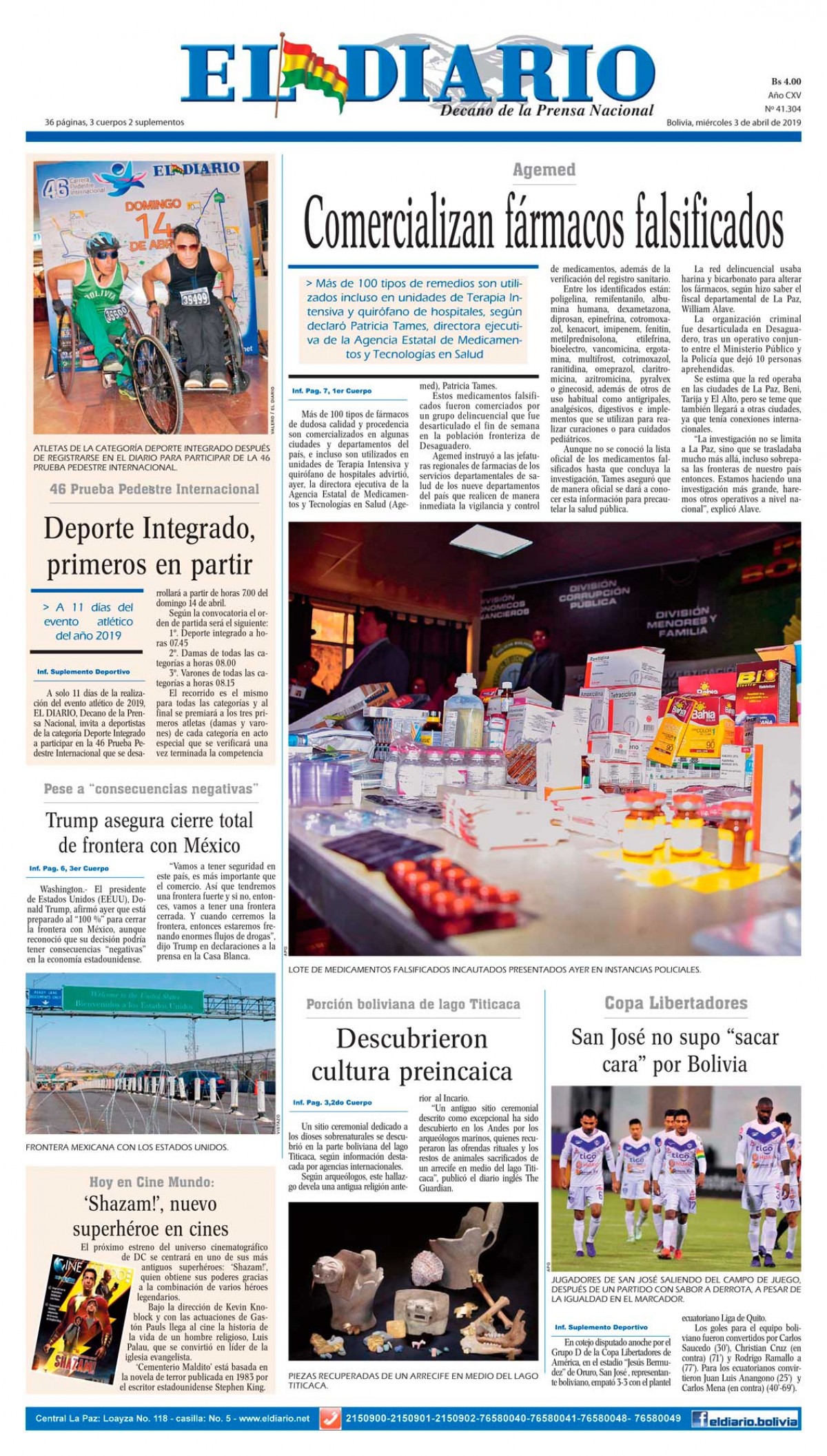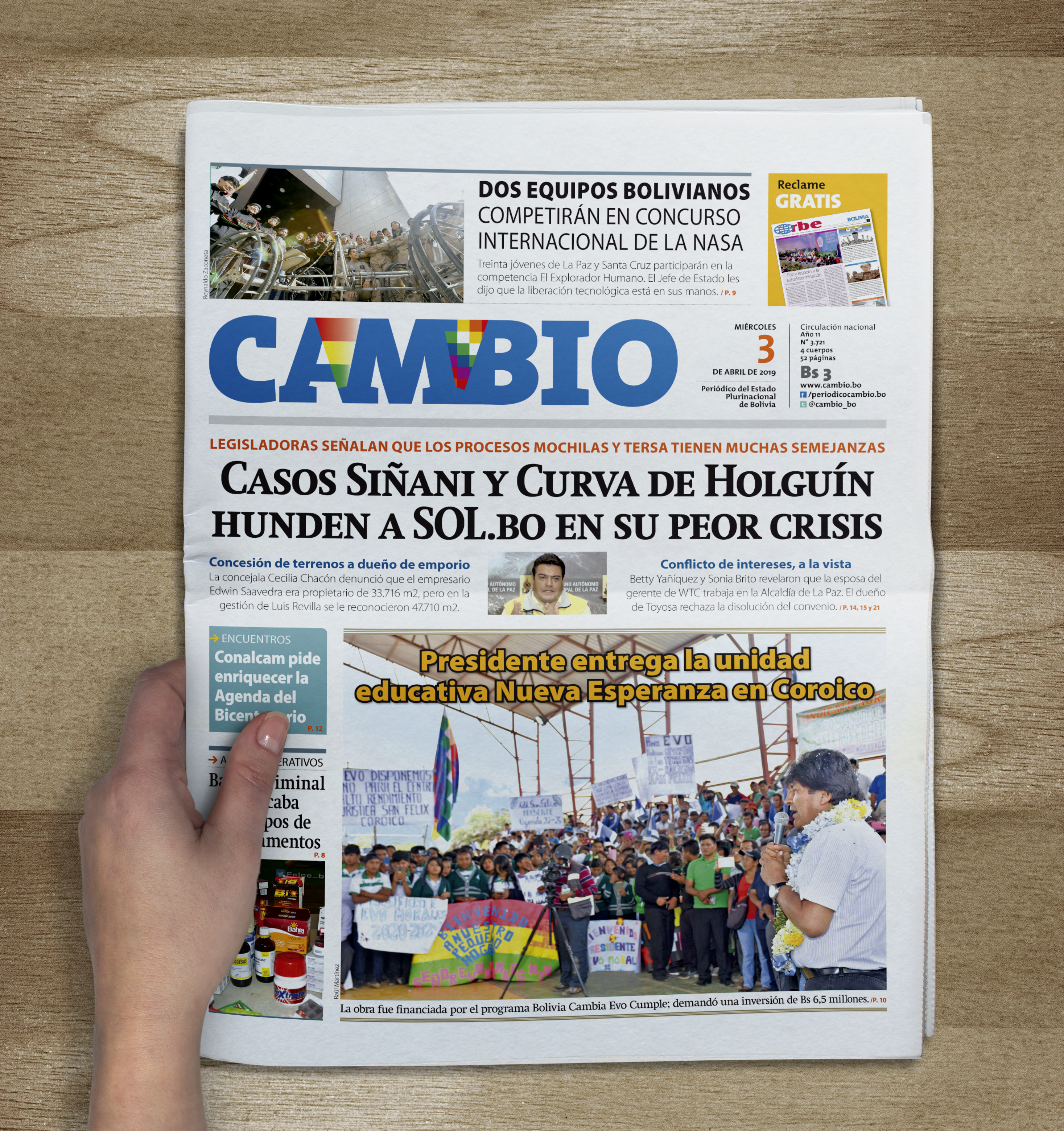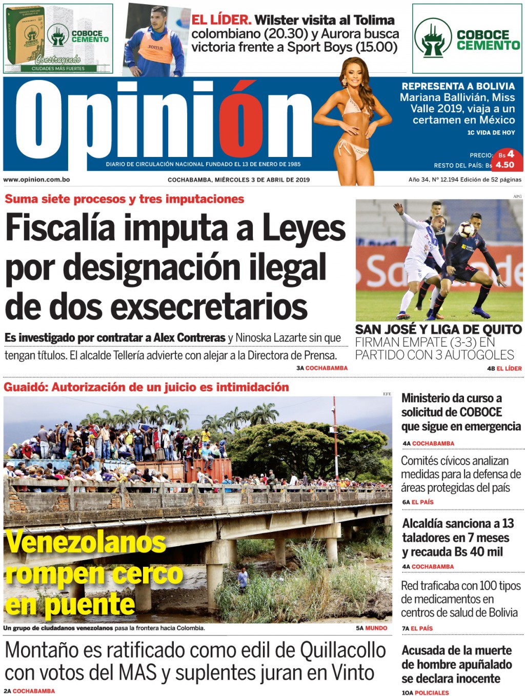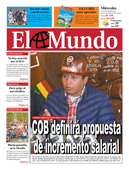 Portadas de periódicos de Bolivia del miércoles 3 de abril de 2019Categorías MonitoreoEtiquetas , Portadas de periódicos 03/04/2019 El Deber – Los Tiempos – El Día – La Razón – Cambio – El Diario – Página Siete – Opinión