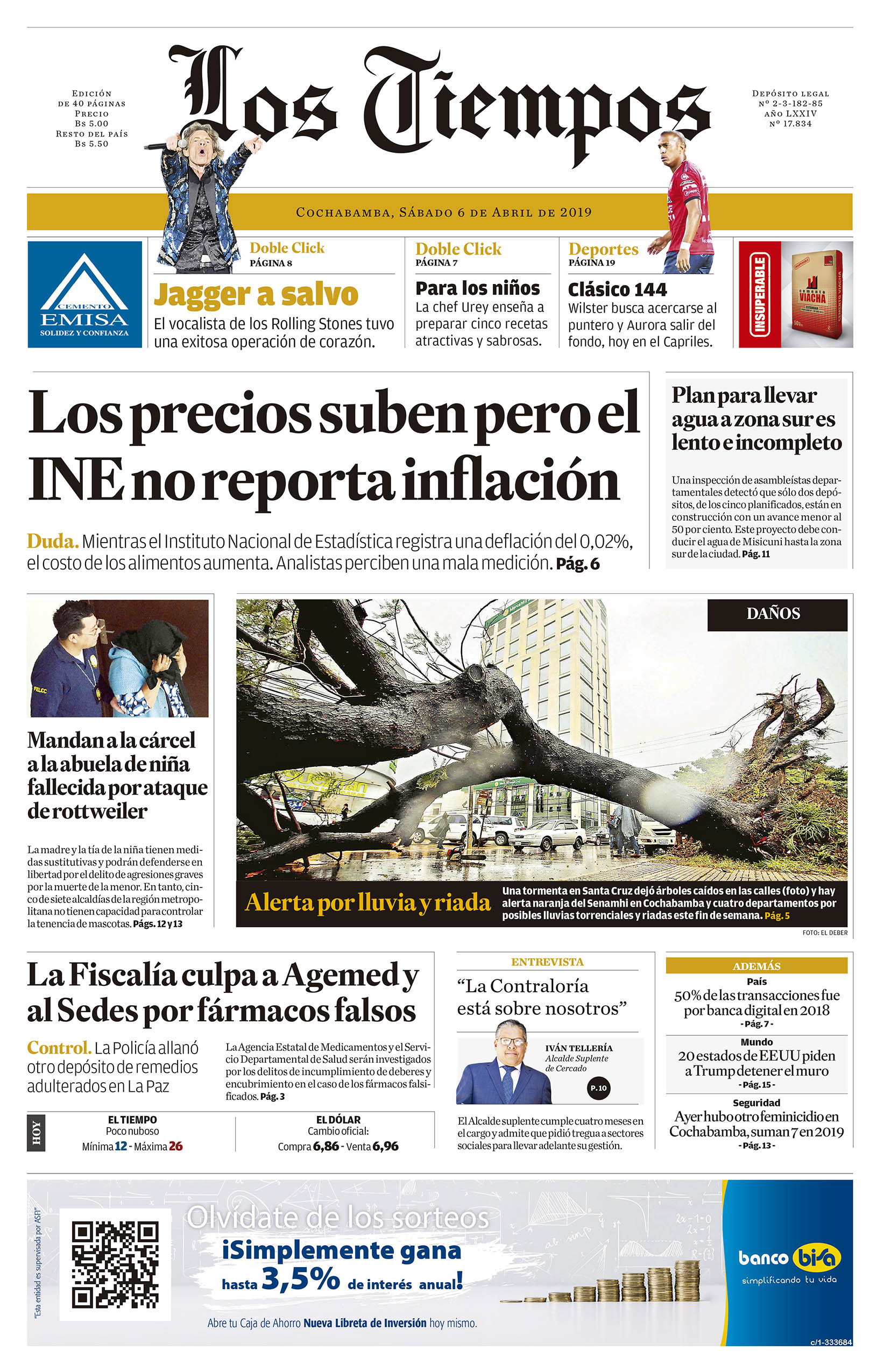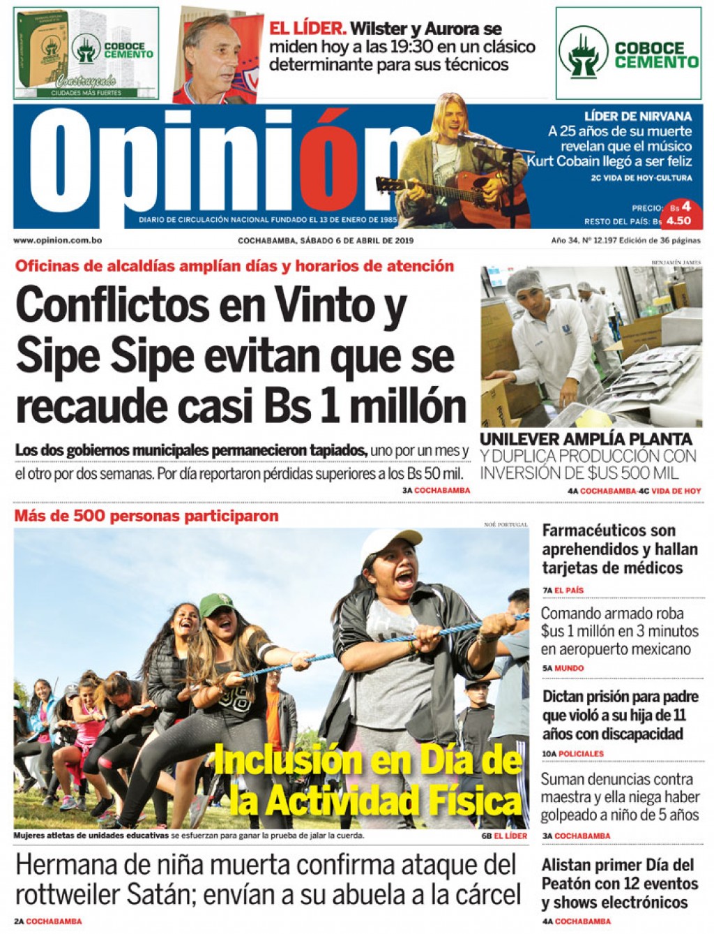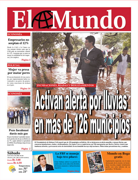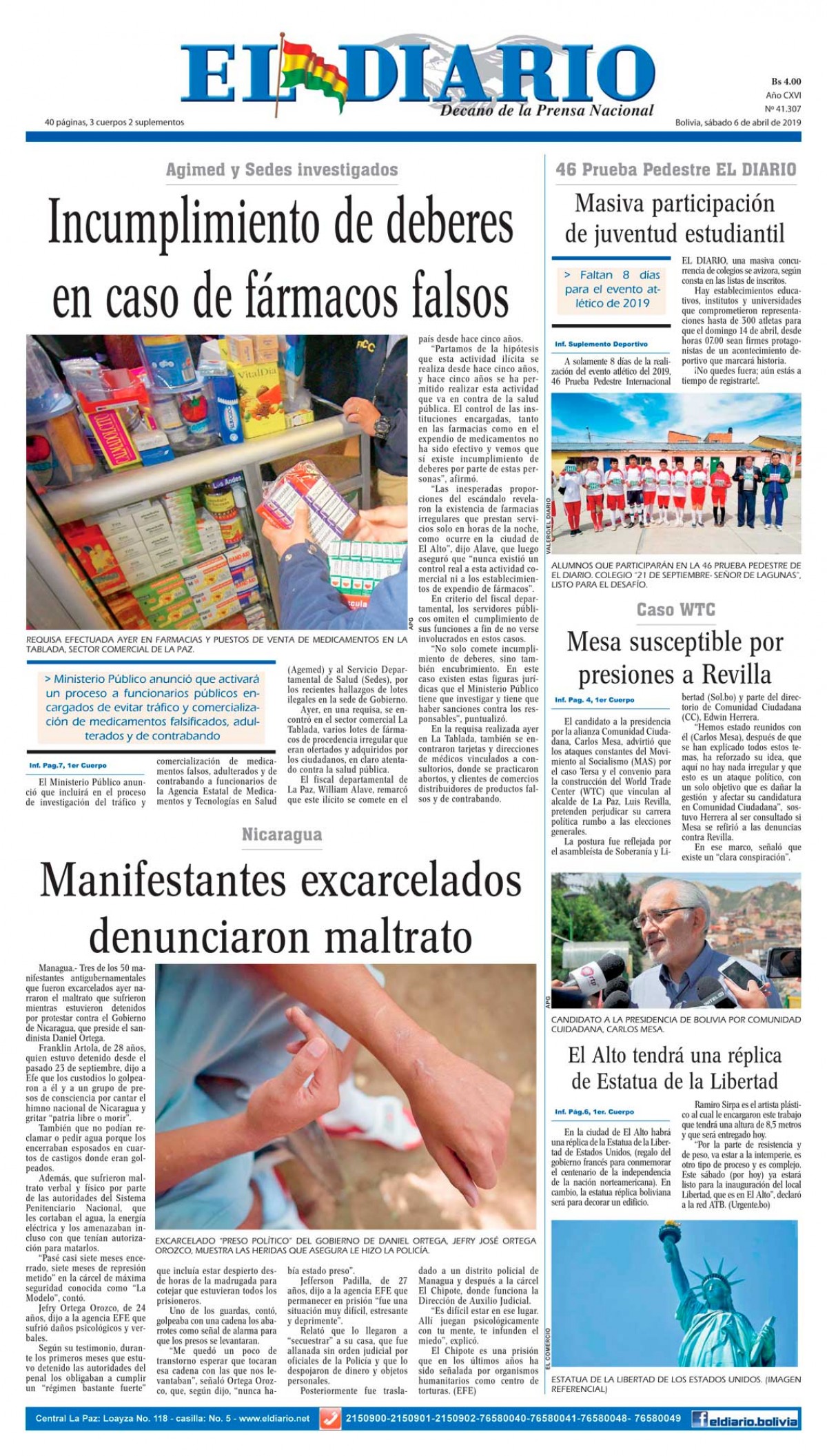 Portadas de periódicos de Bolivia del sábado 6 de abril de 2019Categorías MonitoreoEtiquetas , Portadas de periódicos 06/04/2019 El Deber – Los Tiempos – El Día – La Razón – Cambio – El Diario – Página Siete – Opinión