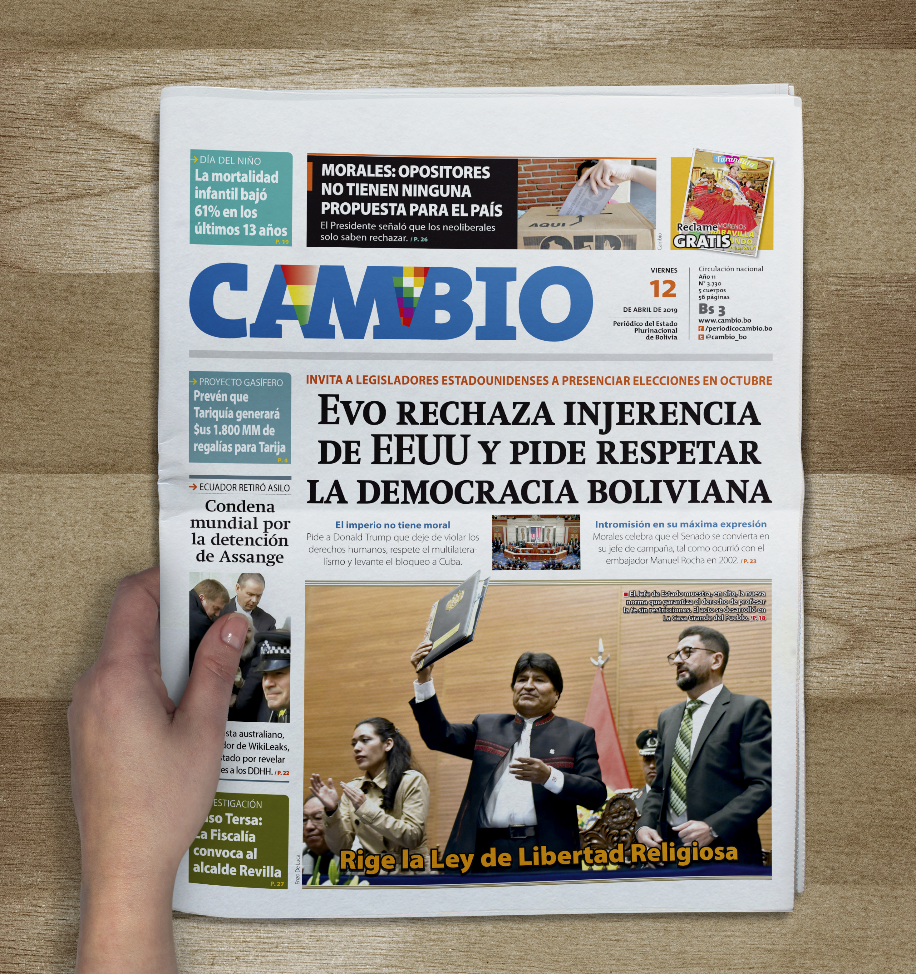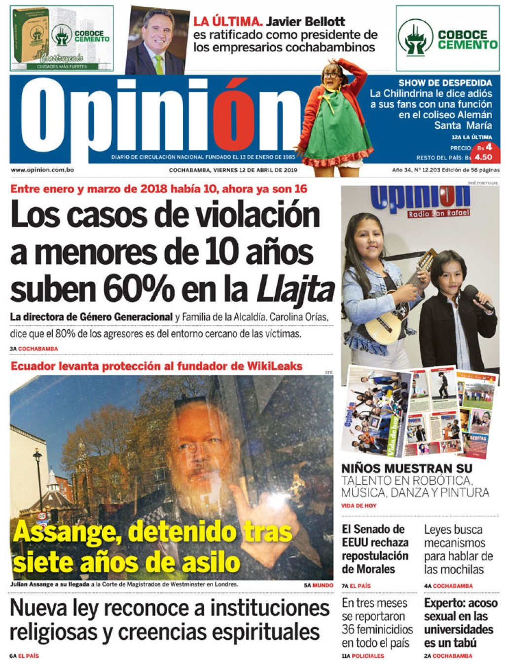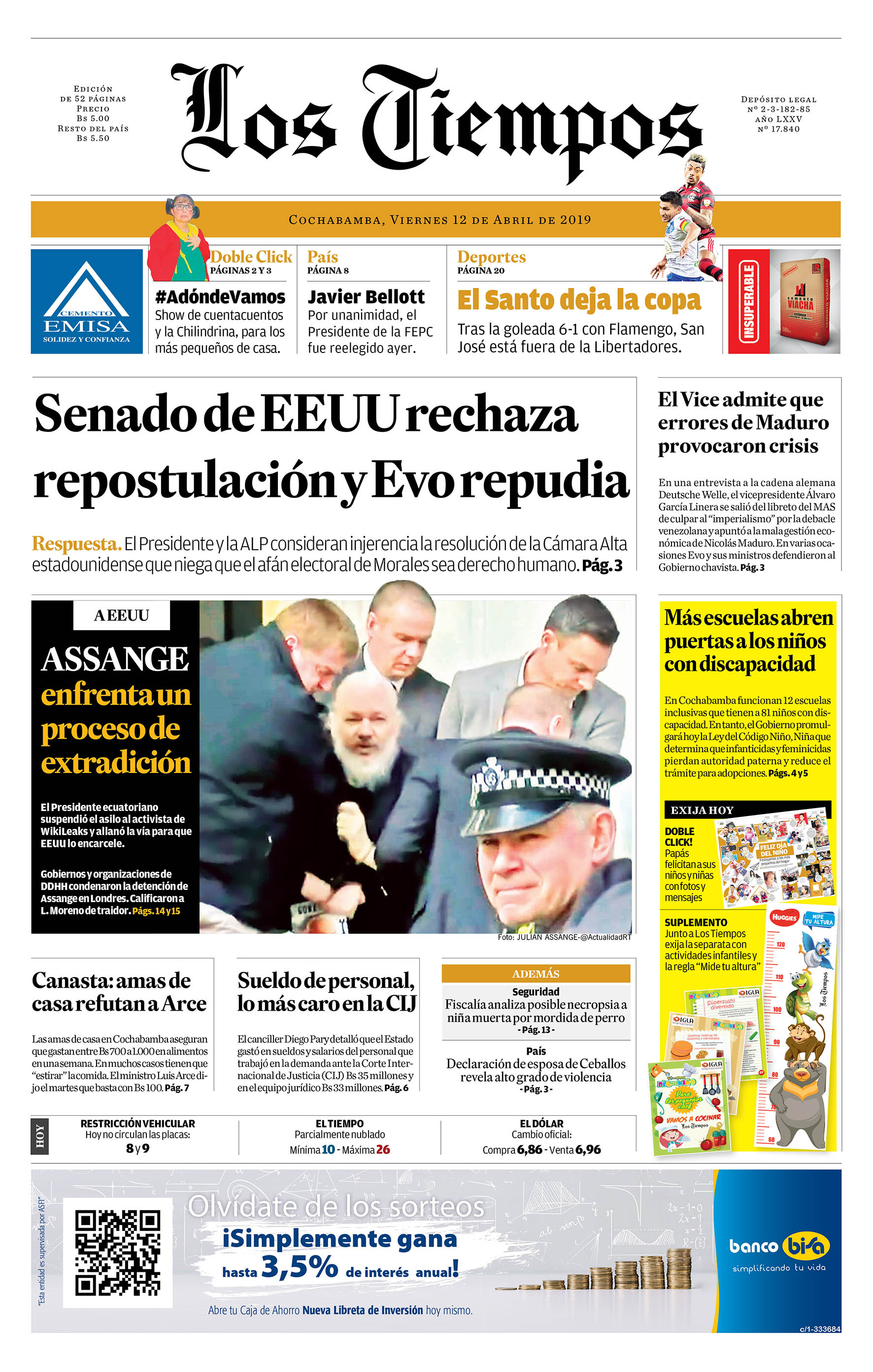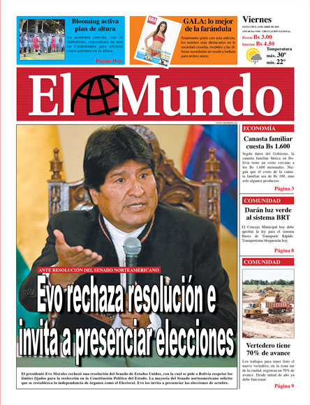 Portadas de periódicos de Bolivia del viernes 12 de abril de 2019