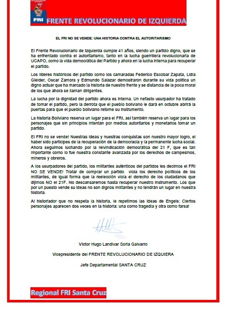 En ocasión del aniversario número 41 del FRI, su vicepresidente Víctor Hugo Landívar envió una carta a la militancia, recordando la historia de lucha por la democracia de esa fuerza política y cuestionado al “nefasto usurpador que ha tratado de tomar el partido”.Landívar hace alusión a la alianza suscrita con Carlos Mesa, acuerdo que en anteriores misivas calificó de ilegal y antiestatutario. “El FRI no se vende: una historia contra el autoritarismo”, titula la nueva carta, donde enfatiza que “la lucha por la dignidad del partido ahora es interna”. “Al historiador que no respeta la historia le repetimos las ideas de Engels: ciertos personajes aparecen dos veces en la historia, una como tragedia y otra como farsa”, finaliza el texto.