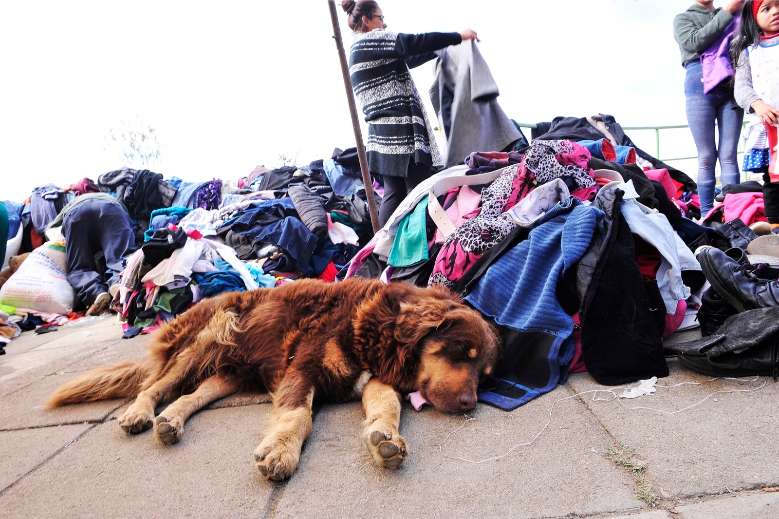 - Una mascota descansa cerca de un punto de acopio de ropa para los damnificados. Foto: Pedro Lagura