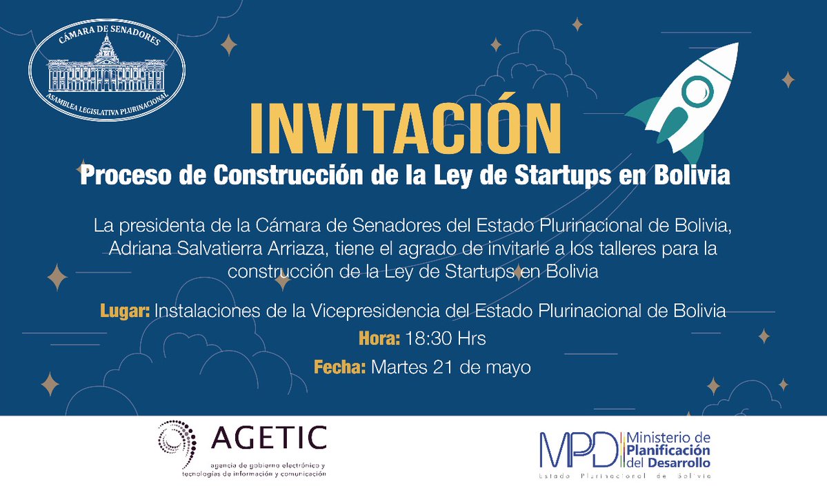 Los espero mañana martes 21 de mayo a las 18:30 hrs, en la @VPEP_Bol para construir juntas y juntos el Proyecto de Ley de #Startups (emprendimientos tecnológicos) en #Bolivia. Estos talleres iniciarán en La Paz, para después continuar por todo el eje troncal del país. https://t.co/2jag6uA8mI