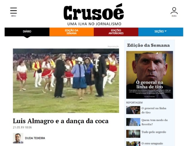 El periodista brasileño Duda Teixeira, autor del recordado reportaje “La república de la cocaína”, publicó anteayer en el periódico Crusoé un nuevo artículo, titulado “Luis Almagro y la danza de la coca”.En la nota, además de dar cuenta del polémico aval del secretario general de la OEA a la reelección de Evo Morales, remarca su visita a Chimoré, epicentro del circuito coca-cocaína en Bolivia. “En un evento en un estadio de fútbol, él bailó de traje en el césped. De acuerdo con el ex presidente de Bolivia, Tuto Quiroga, Almagro bailó en compañía de Margarita Terán, que pertenece al partido MAS, del presidente Evo Morales. En 2008, las dos hermanas de Margarita, Juana y Elva, fueron detenidas con 147 kilos de pasta base de cocaína”, indica el artículo.Ver la nota completa en PDFCrusoeLink a la nota original en portugués