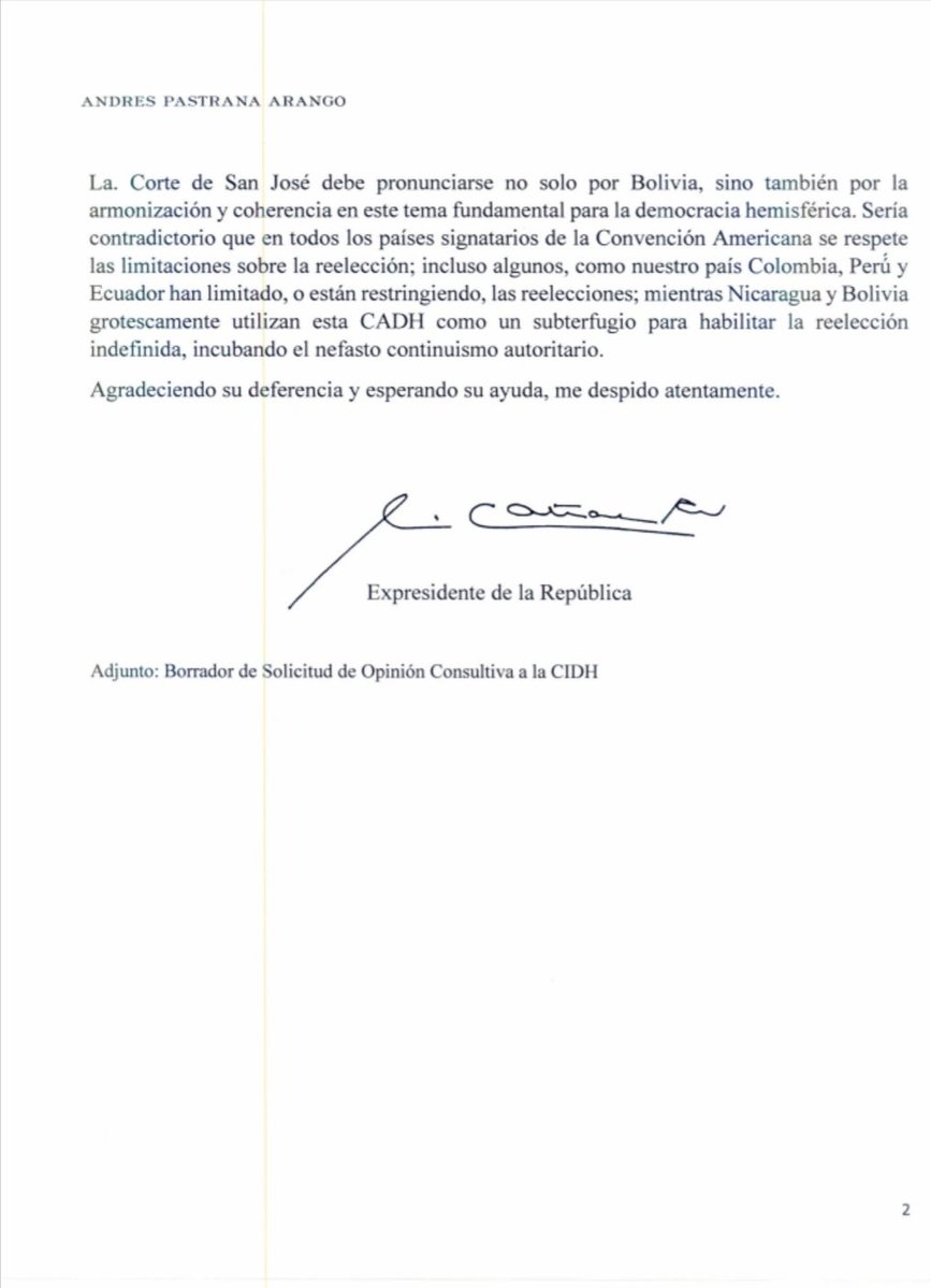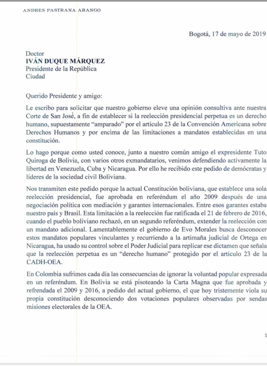 Desde Twitter, el ex presidente Andrés Pastrana envió un mensaje: “Bolivianos, no están solos”, adjuntando la carta que envió ayer al actual mandatario de Colombia, Iván Duque, para que el gobierno de ese país haga la consulta a la Corte Interamericana de Derechos Humanos sobre el intento de reelección de Evo Morales.Por su parte, el candidato presidencial de Bolivia Dice No, Oscar Ortiz, agradeció a Pastrana por el apoyo a “la causa democrática boliviana” y remarcó que “no renunciaremos al 21F”. @AndresPastrana_: «Bolivianos, no están solos. Los demócratas consecuentes seguimos con ustedes. Hoy pedí @IvanDuque que Colombia como garante de la Constitución que hoy se viola, eleve opinión consultiva a Corte San Jose, porque referéndum 21F se debe respetar».@OscarOrtizA: «Gracias al presidente @AndresPastrana_ por esta gestión con la que apoya la causa democrática boliviana. Somos un pueblo que lucha por su democracia y por el respeto a nuestro voto. No aceptamos que Bolivia vaya por el camino de Venezuela y no renunciaremos al #21F #BoliviaDiceNo».