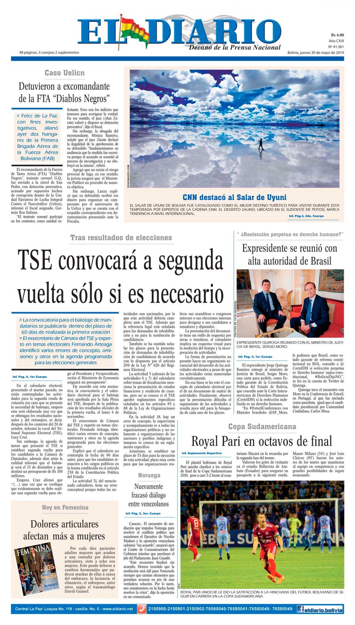 Portadas de periódicos de Bolivia del jueves 30 de mayo de 2019Categorías MonitoreoEtiquetas , Portadas de periódicos 30/05/2019 El Deber – Los Tiempos – El Día – La Razón – Cambio – El Diario – Página Siete – Opinión