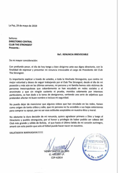 De manera oficial, el presidente de The Strongest, Henry Salinas, presentó su renuncia irrevocable al cargo la mañana de este miércoles poniendo fin al ciclo de la familia Salinas al mando del club paceño. La salida del titular atigrado se habló desde el domingo debido a la presión de una parte de la hinchada.