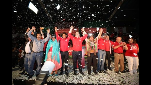 El candidato de BOLIVIA DICE NO (21F) a la Presidencia de Bolivia, Óscar Ortiz, fue proclamado por sus seguidores en un acto en el coliseo John Píctor Blanco de Santa Cruz, donde también asistieron representantes de organizaciones con las que se firmó acuerdos.»Evo sabe que solo nosotros podemos ganar estas elecciones. Por eso dejó que otros (candidatos) crecieran, porque sabía que tenían los pies de barro. Es muy fácil derrotar a un gobierno del pasado. Lo que es difícil es derrotar al futuro», expresó en su discurso.La organización política estima que cerca de 5.000 personas asistieron al evento que casi llenó el escenario deportivo. El gobernador Rubén Costas, Ernesto Justiniano, entre otros, también estuvieron presentes en la cita.Ortiz dijo que mientras otros discuten y twittean, ellos construyen unidad en el país, por lo que considera que son una alternativa real al candidato oficialista. «Hace cuatro meses nadie creía en nosotros; ahora ya somos la alternativa incluyente. La que sigue creciendo, la única que sigue creciendo. Nos quedan menos de cinco meses, pero en ese tiempo vamos a llevar esta alternativa de cambio a cada rincón de Bolivia. Que otros se queden mandando tuits, nosotros llegaremos a cada rincón del país para incluir a todos los bolivianos», manifestó.EL DEBER