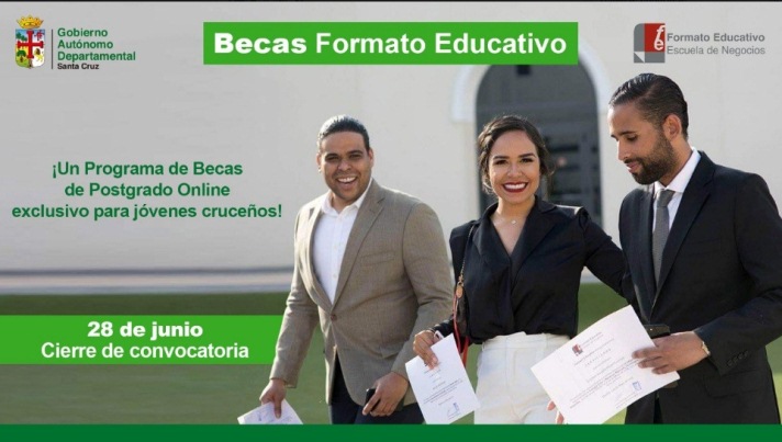 El Gobierno Autónomo Departamental de Santa Cruz tiene el desafío de apoyar la formación de recursos humanos y la promoción del conocimiento, con miras a lograr el desarrollo humano y fortalecer la investigación que consolide el desarrollo socio-productivo en el departamento de Santa Cruz.Dentro del cumplimiento de estas metas, ha logrado comprometer la participación de una importante entidad educativa española como Formato Educativo – Escuela de Negocios (FE), para ofertar 30 (treinta) becas de postgrado online o semi presencial, destinadas a jóvenes profesionales, para coadyuvar en su continua formación educativa en las áreas de mayor importancia que influyan positivamente en la base del conocimiento y aprendizaje a nivel post gradual para su aplicación dentro de las instituciones públicas y privadas de nuestra región.La convocatoria vence el 28 de junio. Ver las bases completas aquí.
