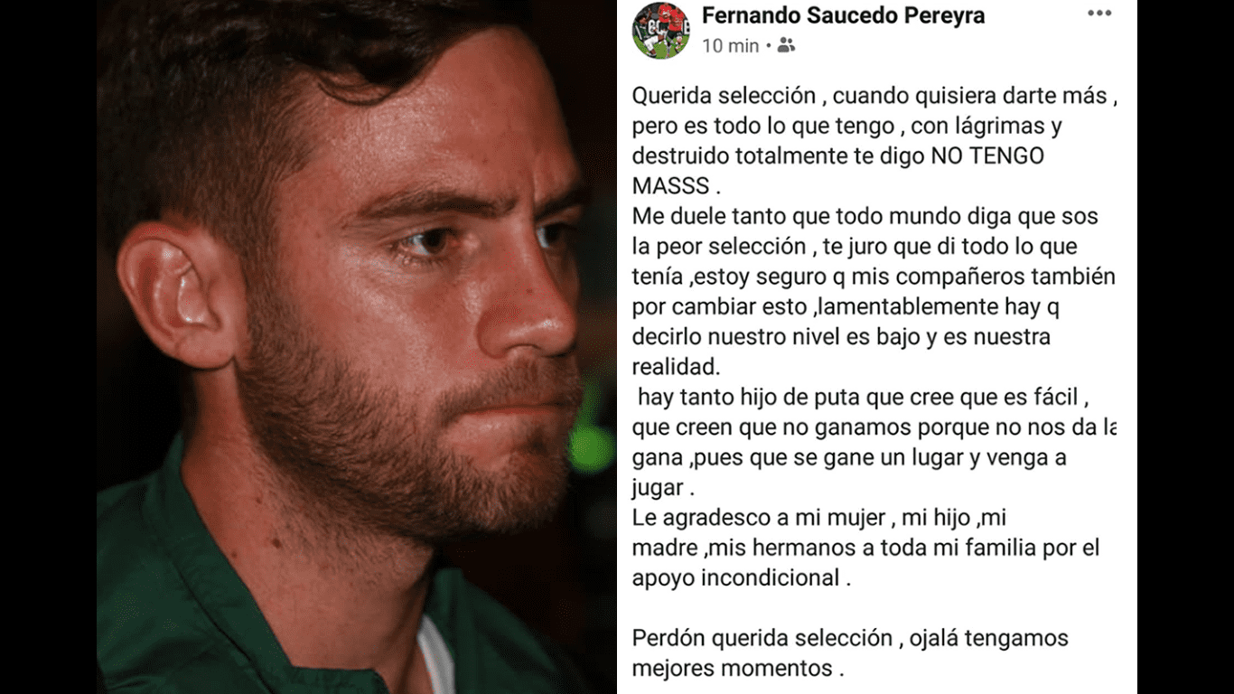 El volante Fernando Saucedo no halló mejor aliado que las redes sociales para desahogarse por la frustración que le dejó la eliminación de Bolivia en la Copa América. “Querida selección cuando quisiera darte más, pero es todo lo que tengo. Con lágrimas y destruido te digo no tengo más”, dice la primera parte del post que lanzó en su cuenta de Facebook y de Instagram.