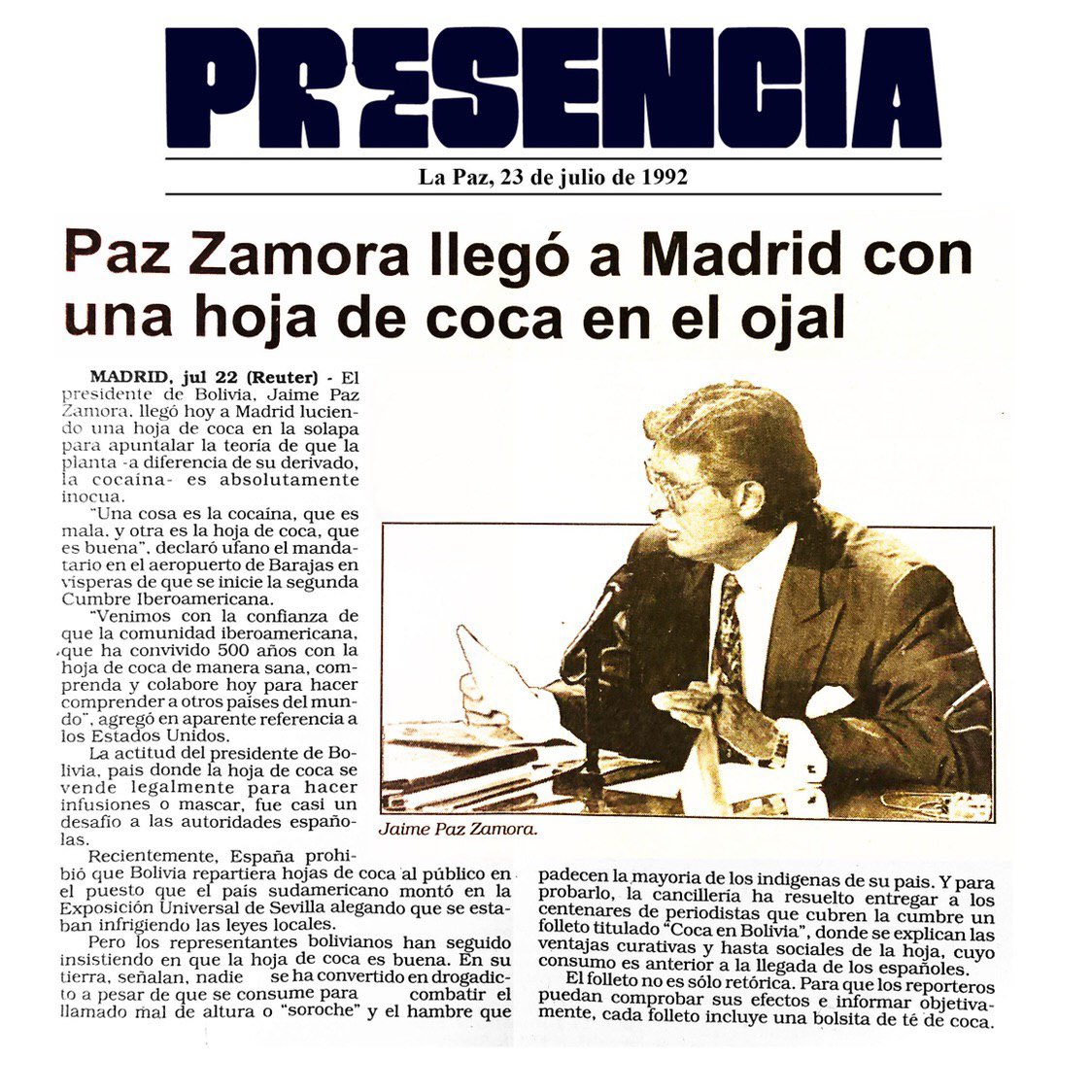 Como hoy, 1992, se informó que en su visita a #España, Jaime Paz Zamora lucía una hoja de coca en la solapa. El expresidente afirmaba defender nuestra hoja milenaria, pero a la vez permitía la instalación de bases militares de #EEUU y la represión impune de la DEA en nuestro país https://t.co/RHWbJayPuO