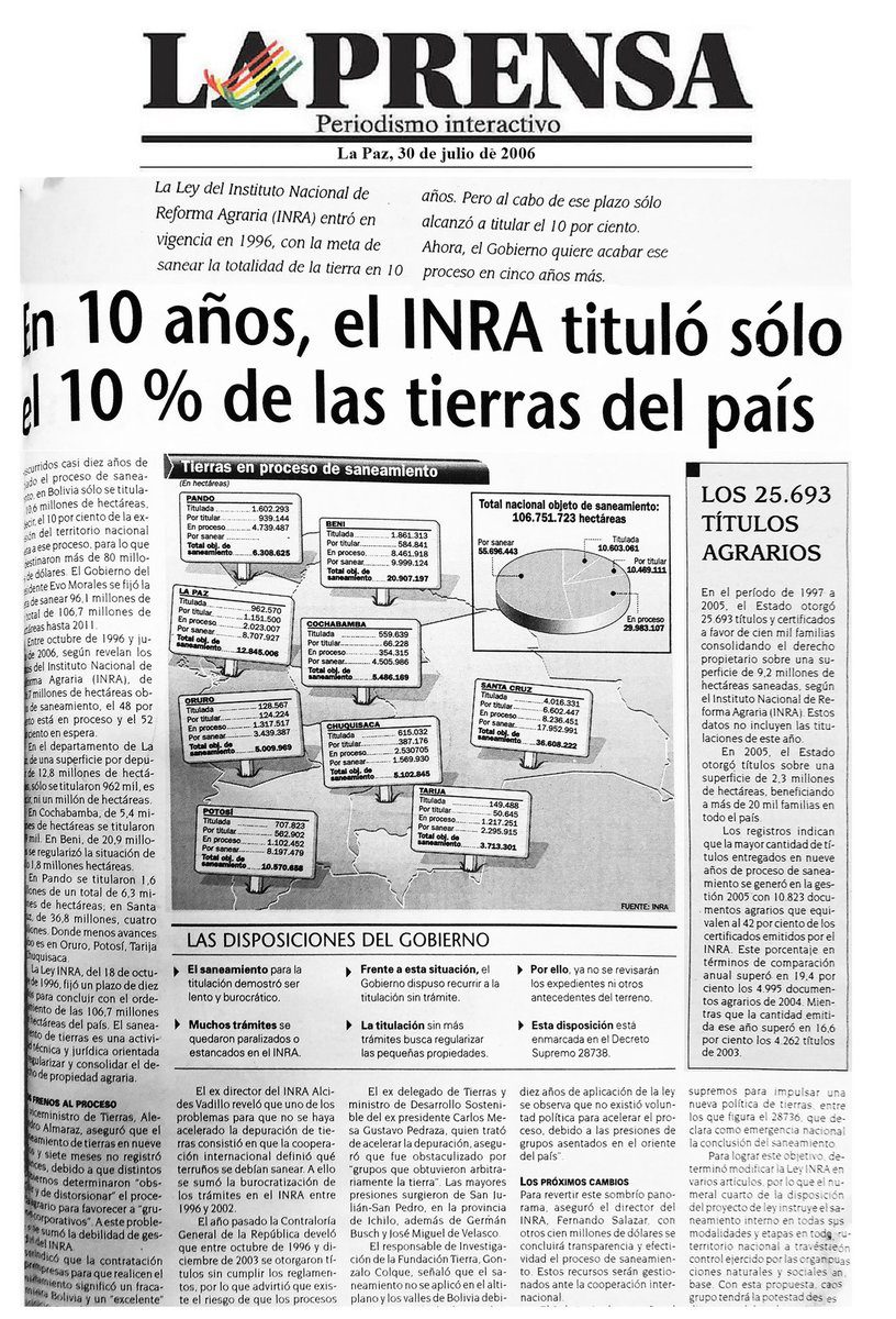 Como hoy, 2006, se informó que en los últimos 10 años el INRA había titulado solo el 10 % de las tierras disponibles. Desde entonces y hasta 2018, nuestro Proceso saneó y tituló 75,3 millones de h. Ahora la tierra está en manos del pueblo y la producción del agro es una prioridad https://t.co/Qfm1tmgO75
